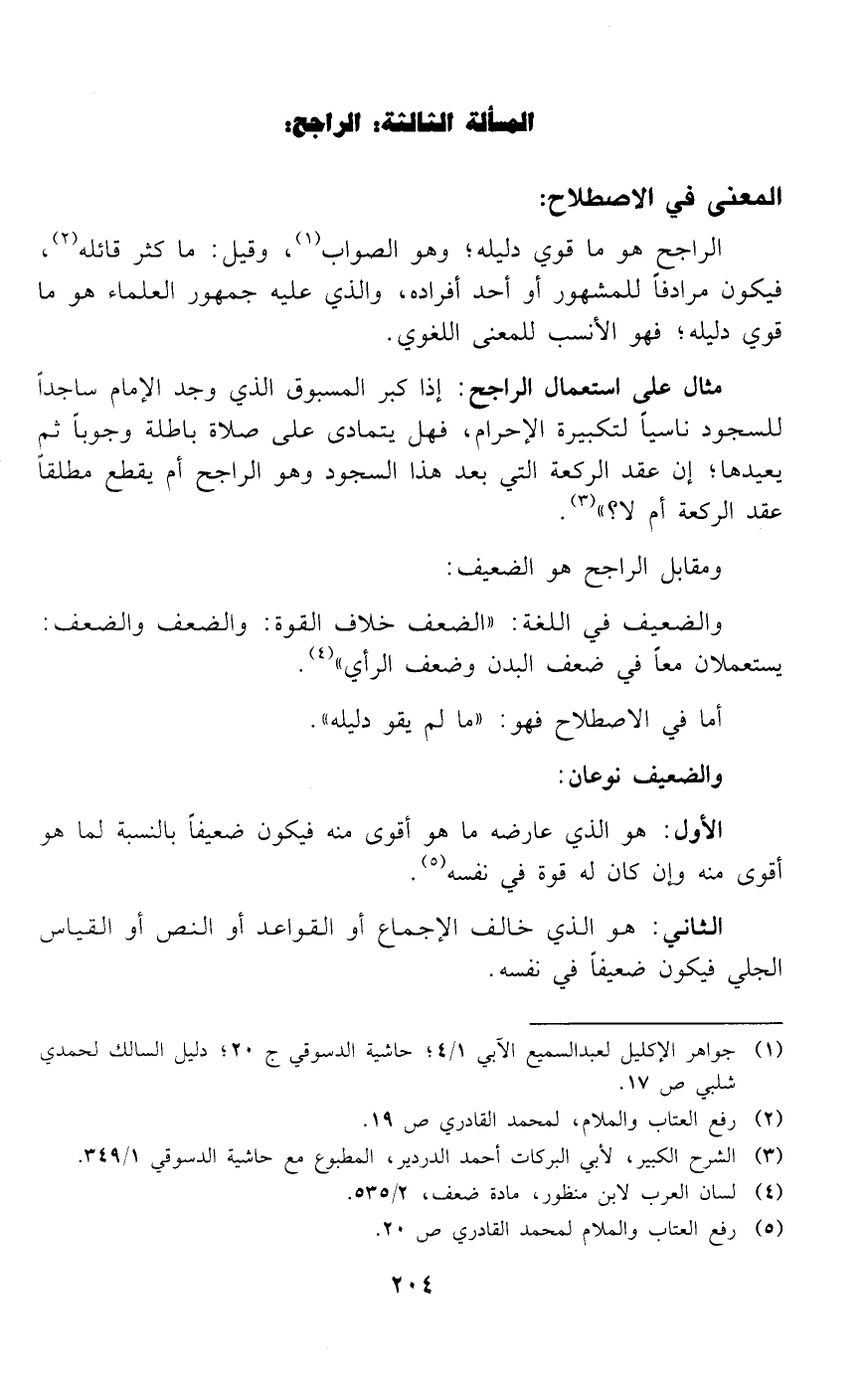مثال على استعمال الراجح: إذا كبر المسبوق الذي وجد الإمام ساجدا للسجود ناسيا لتكبيرة الإحرام، فهل يتمادى على صلاة باطلة وجوبا ثم يعيدها؛ إن عقد الركعة التي بعد هذا السجود وهو الراجح أم يقطع مطلقا عقد الركعة أم لا؟» (¬3).