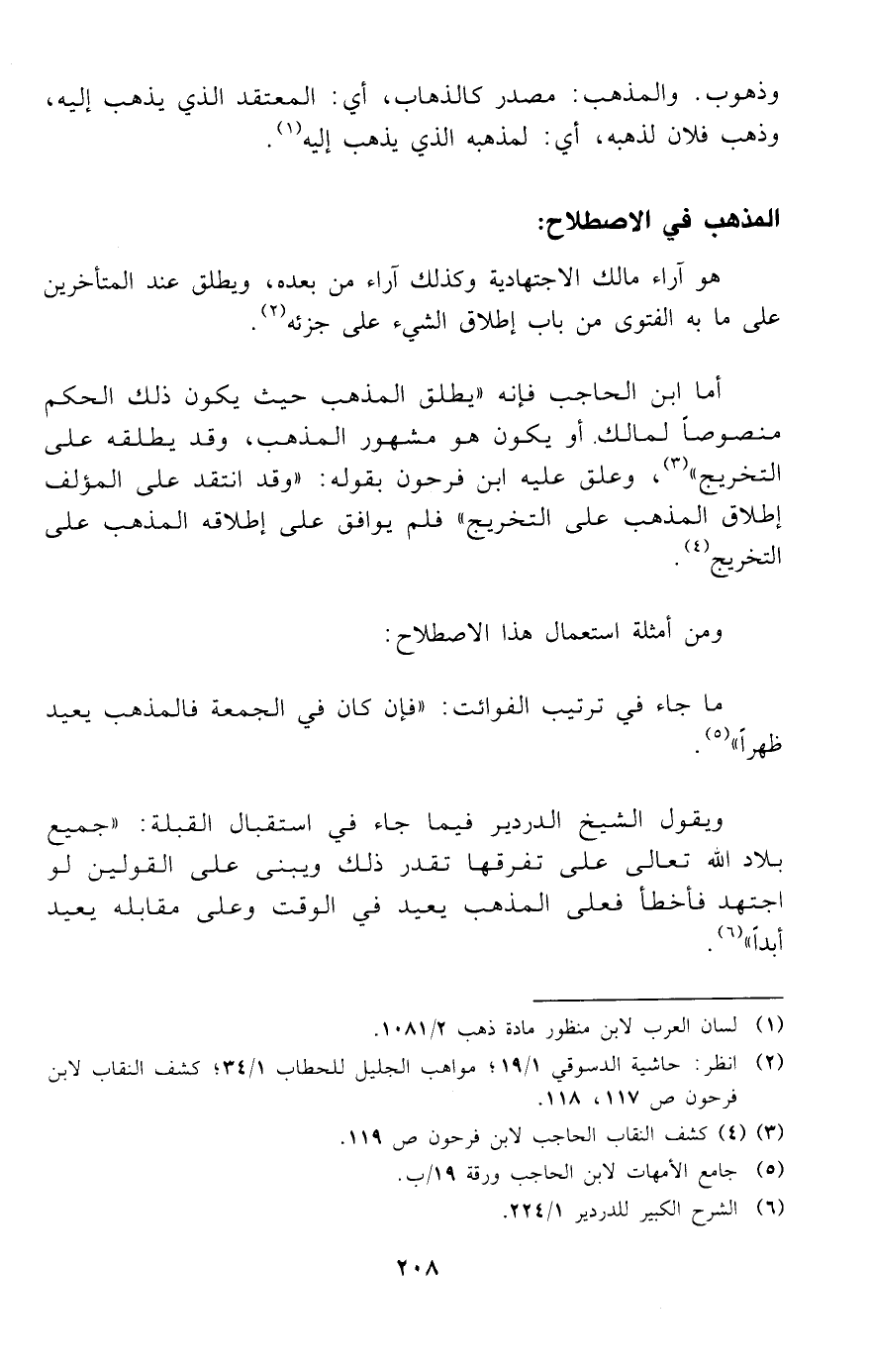 أما ابن الحاجب فإنه «يطلق المذهب حيث يكون ذلك الحكم منصوصا لمالك أو يكون هو مشهور المذهب، وقد يطلقه على التخريج» (¬3)، وعلق عليه ابن فرحون بقوله: «وقد انتقد على المؤلف إطلاق المذهب على التخريج» فلم يوافق على إطلاقه المذهب على التخريج (¬4).