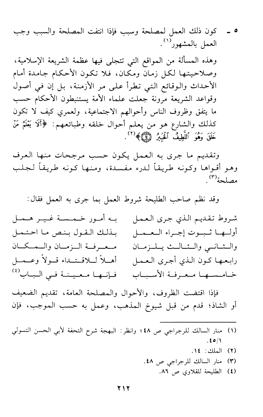 وقد نظم صاحب الطليحة شروط العمل بما جرى به العمل فقال: