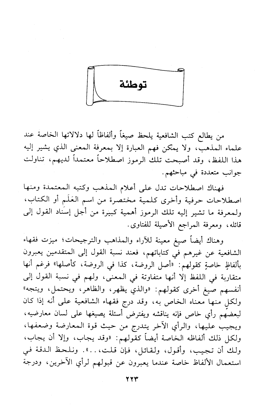 وهناك أيضا صيغ معينة للآراء والمذاهب والترجيحات؛ ميزت فقهاء الشافعية عن غيرهم في كتاباتهم، فعند نسبة القول إلى المتقدمين يعبرون بألفاظ خاصة كقولهم: «أصل الروضة، كذا في الروضة، كأصلها» فرغم أنها متقاربة في اللفظ إلا أنها متفاوتة في المعنى، ولهم في نسبة القول إلى أنفسهم صيغ أخرى كقولهم: «والذي يظهر، والظاهر، ويحتمل، ويتجه» ولكل منها معناه الخاص به، وقد درج فقهاء الشافعية على أنه إذا كان لبعضهم رأي خاص فإنه يناقشه ويفترض أسئلة يصيغها على لسان معارضيه، ويجيب عليها، والرأي الآخر يتدرج من حيث قوة المعارضة وضعفها، ولكل ذلك ألفاظه الخاصة أيضا كقولهم: «وقد يجاب، وإلا أن يجاب، ولك أن تجيب، وأقول، ولقائل، فإن قلت،. . .». ونلحظ الدقة في استعمال الألفاظ خاصة عندما يعبرون عن قبولهم لرأي الآخرين، ودرجة