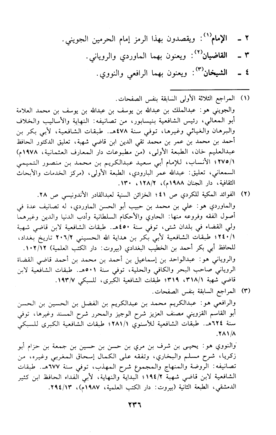 (¬3) المراجع السابقة بنفس الصفحات. والرافعي هو: عبد الكريم محمد بن عبد الكريم بن الفضل بن الحسين بن الحسن أبو القاسم القزويني مصنف العزيز شرح الوجيز والمحرر شرح المسند وغيرها، توفي سنة 624 هـ. طبقات الشافعية للأسنوي 1/ 281؛ طبقات الشافعية الكبرى للسبكي 8/ 281. والنووي هو: يحيى بن شرف بن مري بن حسن بن حسين بن جمعة بن حزام أبو زكريا، شرح مسلم والبخاري، وتفقه على الكمال إسحاق المغربي وغيره، من تصانيفه: الروضة والمنهاج والمجموع شرح المهذب، توفي سنة 677 هـ. طبقات الشافعية لابن قاضي شهبة 2/ 194؛ البداية والنهاية، لأبي الفداء الحافظ ابن كثير الدمشقي، الطبعة الثانية (بيروت: دار الكتب العلمية،1987 م)،13/ 294.