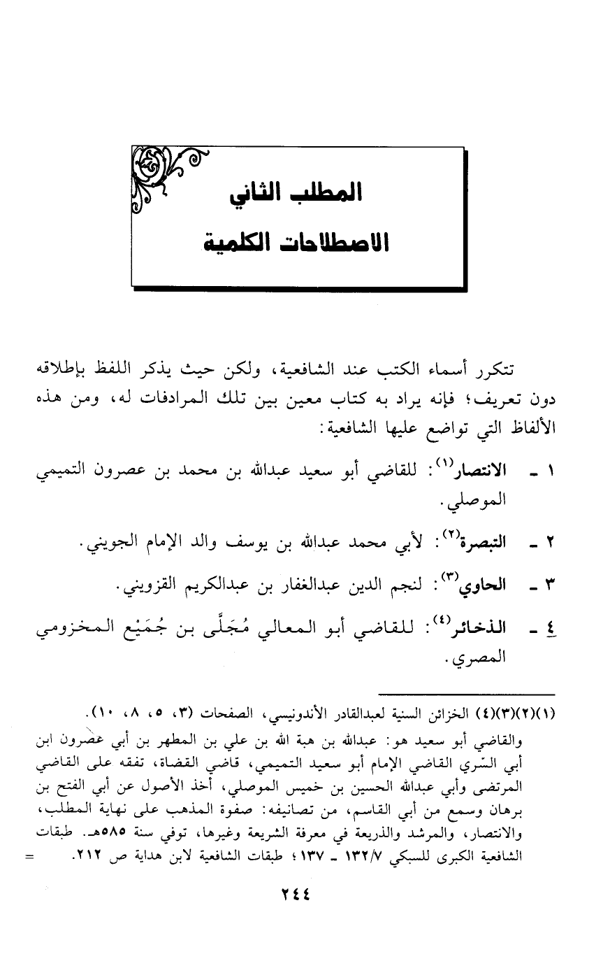 المطلب الثاني الاصطلاحات الكلمية تتكرر أسماء الكتب عند الشافعية، ولكن حيث يذكر اللفظ بإطلاقه دون تعريف؛ فإنه يراد به كتاب معين بين تلك المرادفات له، ومن هذه الألفاظ التي تواضع عليها الشافعية: