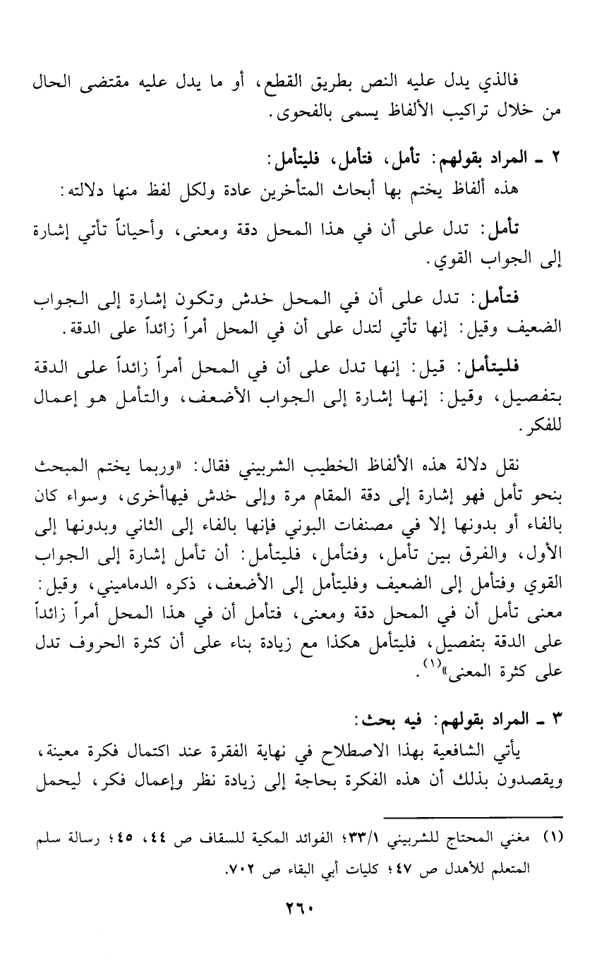نقل دلالة هذه الألفاظ الخطيب الشربيني فقال: «وربما يختم المبحث بنحو تأمل فهو إشارة إلى دقة المقام مرة وإلى خدش فيها أخرى، وسواء كان بالفاء أو بدونها إلا في مصنفات البوني فإنها بالفاء إلى الثاني وبدونها إلى الأول، والفرق بين تأمل، وفتأمل، فليتأمل: أن تأمل إشارة إلى الجواب القوي وفتأمل إلى الضعيف وفليتأمل إلى الأضعف، ذكره الدماميني، وقيل:
