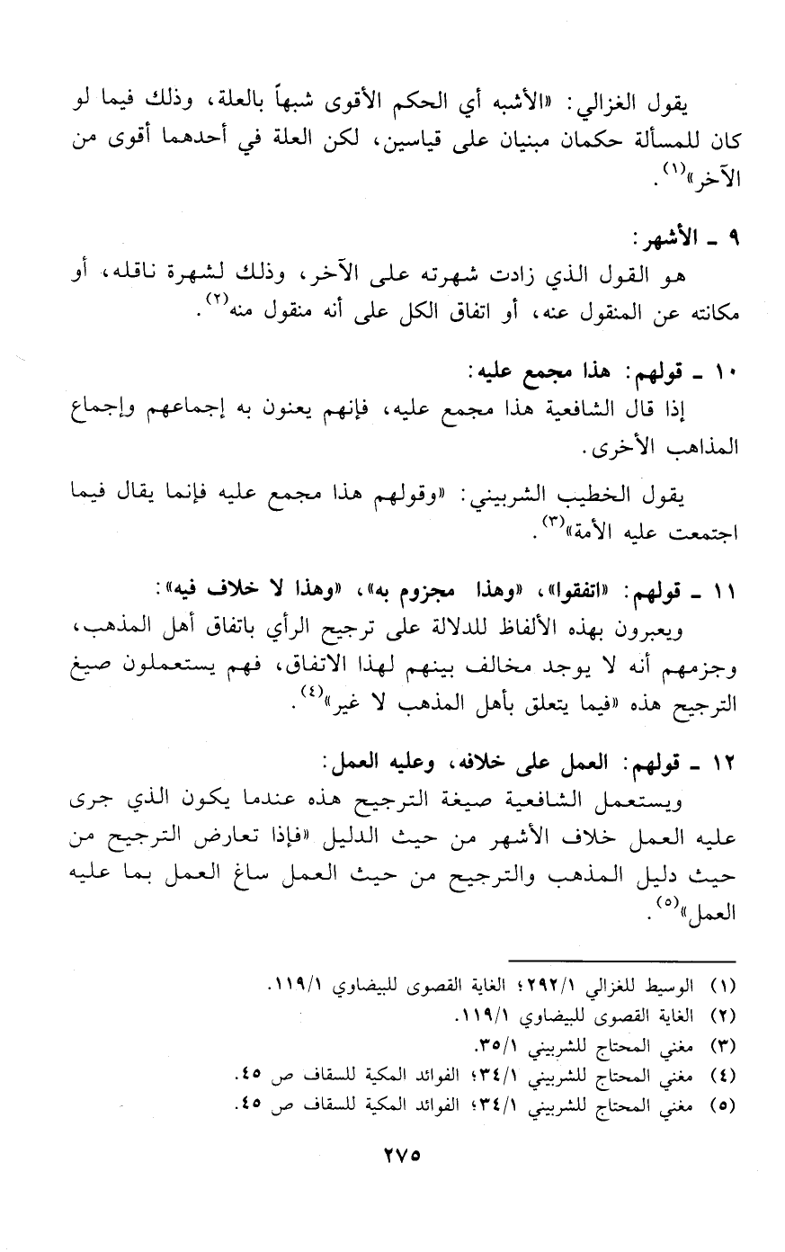 ويستعمل الشافعية صيغة الترجيح هذه عندما يكون الذي جرى عليه العمل خلاف الأشهر من حيث الدليل «فإذا تعارض الترجيح من حيث دليل المذهب والترجيح من حيث العمل ساغ العمل بما عليه العمل» (¬5).