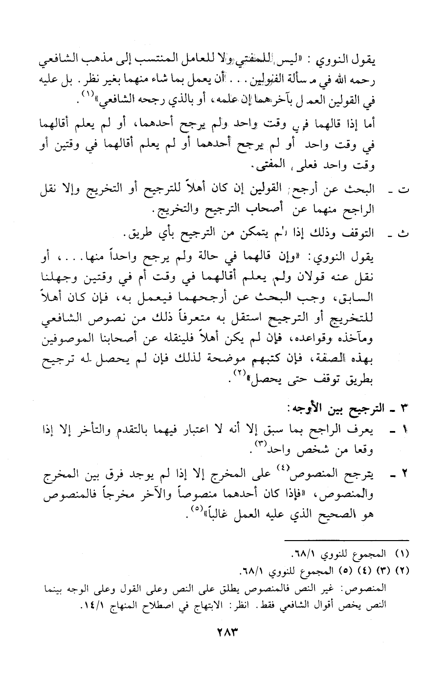 (¬2) - (¬3) - (¬4) - (¬5) المجموع للنووي 1/ 68. المنصوص: غير النص فالمنصوص يطلق على النص وعلى القول وعلى الوجه بينما النص يخص أقوال الشافعي فقط. انظر: الابتهاج في اصطلاح المنهاج 1/ 14.
