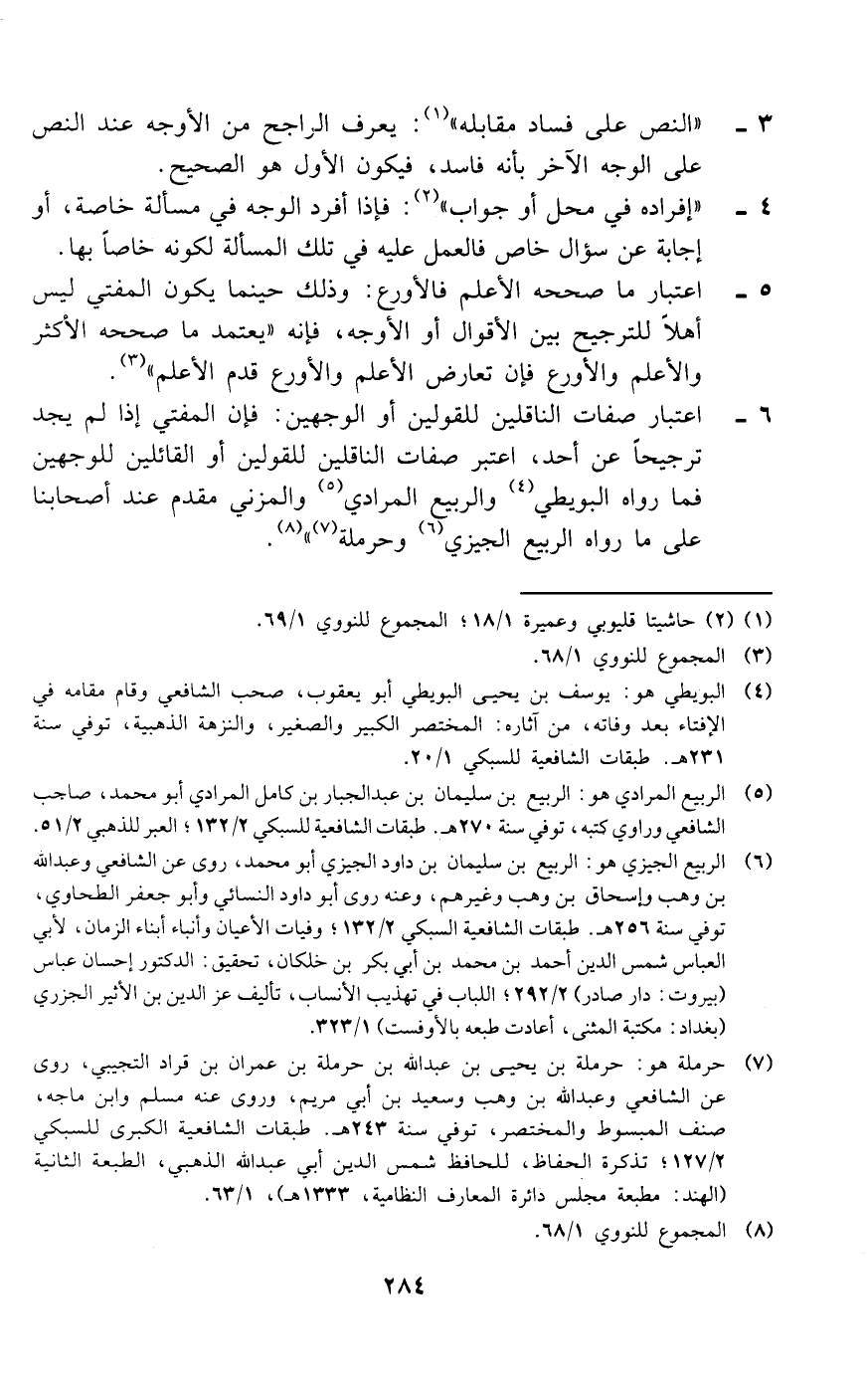 6 - اعتبار صفات الناقلين للقولين أو الوجهين: فإن المفتي إذا لم يجد ترجيحا عن أحد، اعتبر صفات الناقلين للقولين أو القائلين للوجهين فما رواه البويطي (¬4) والربيع المرادي (¬5) والمزني مقدم عند أصحابنا على ما رواه الربيع الجيزي (¬6) وحرملة (¬7)» (¬8).