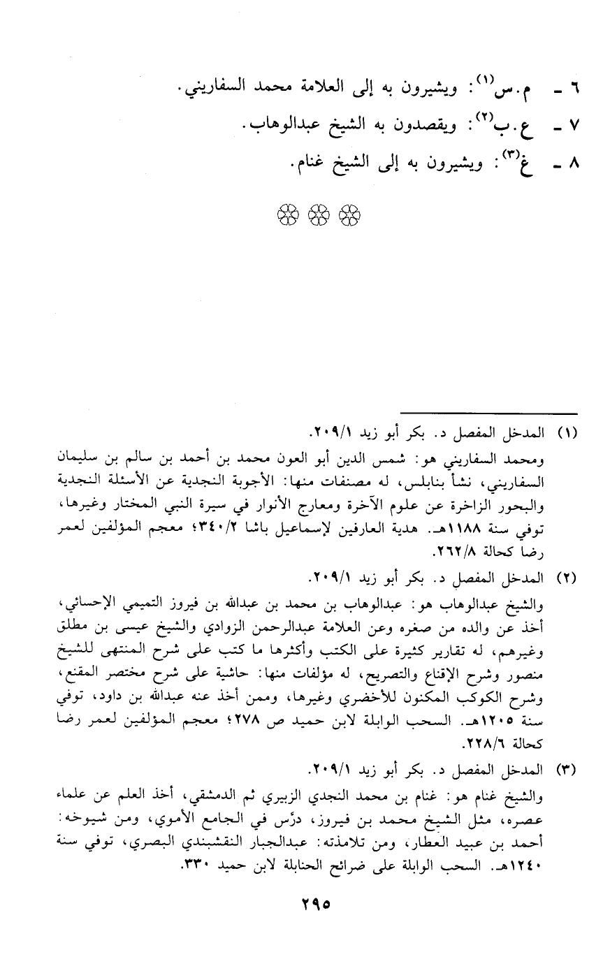 (¬1) المدخل المفصل د. بكر أبو زيد 1/ 209. ومحمد السفاريني هو: شمس الدين أبو العون محمد بن أحمد بن سالم بن سليمان السفاريني، نشأ بنابلس، له مصنفات منها: الأجوبة النجدية عن الأسئلة النجدية والبحور الزاخرة عن علوم الآخرة ومعارج الأنوار في سيرة النبي المختار وغيرها، توفي سنة 1188 هـ. هدية العارفين لإسماعيل باشا 2/ 340؛ معجم المؤلفين لعمر رضا كحالة 8/ 262.