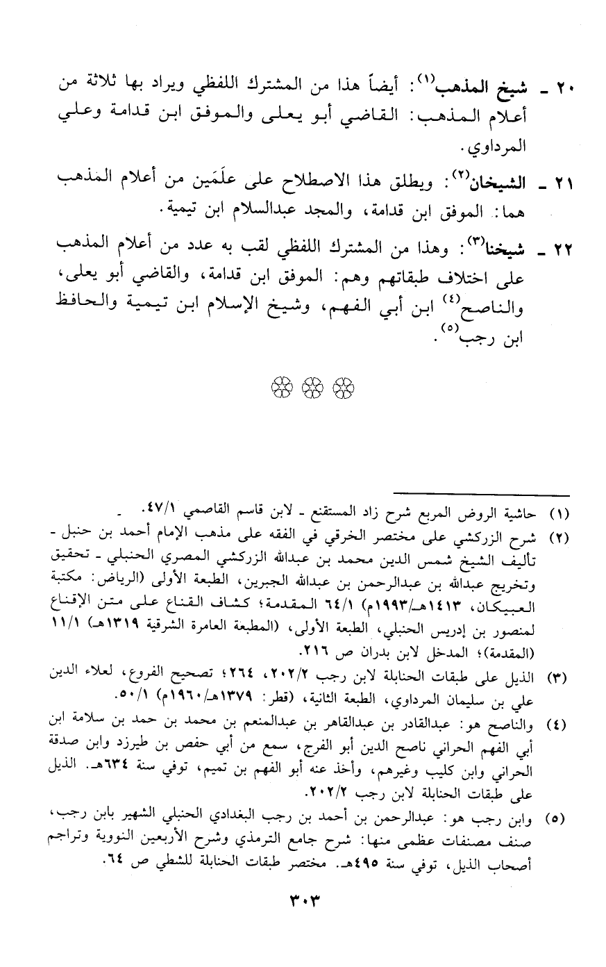 21 - الشيخان (¬2): ويطلق هذا الاصطلاح على علمين من أعلام المذهب هما: الموفق ابن قدامة، والمجد عبد السلام ابن تيمية.