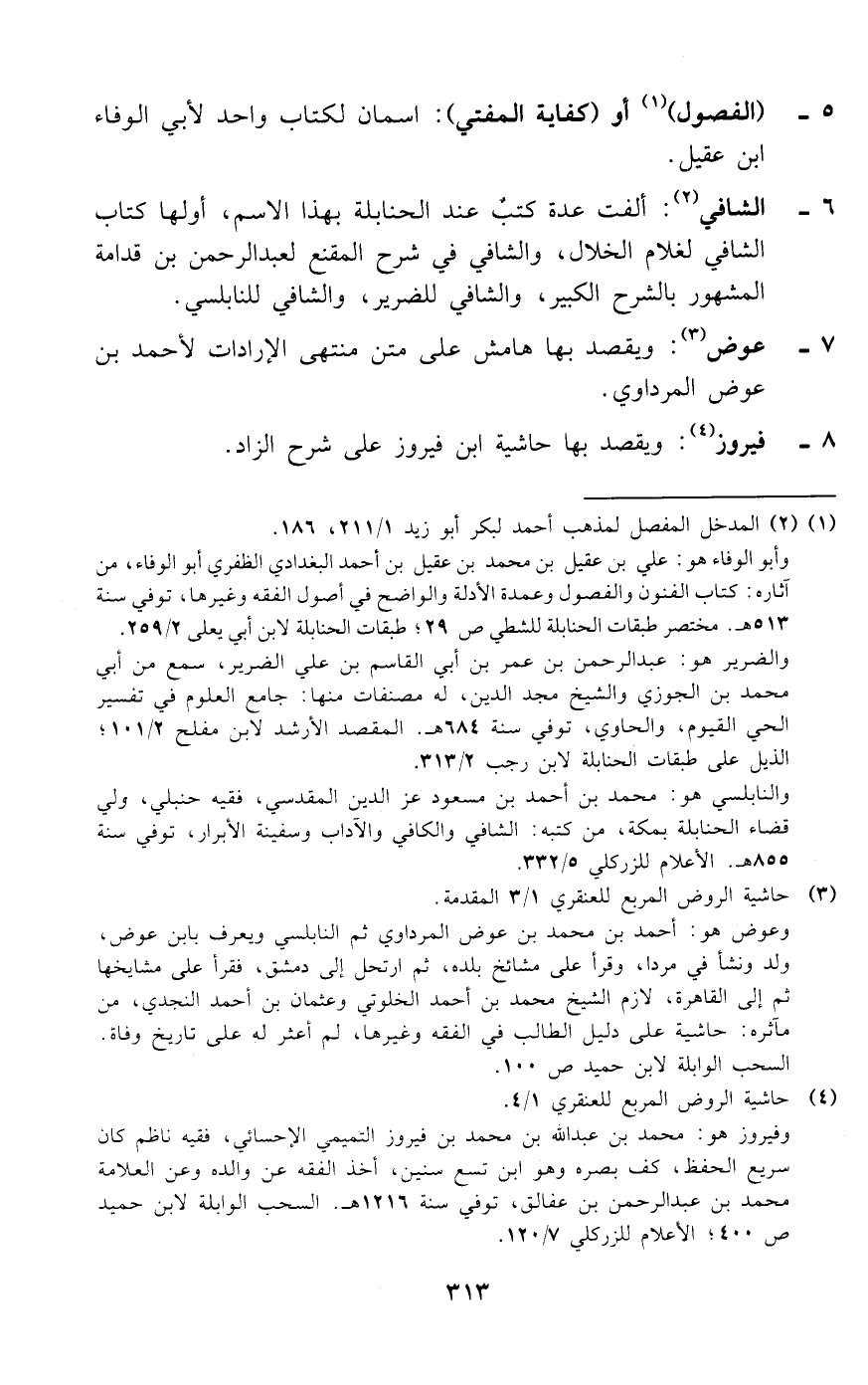 (1 - 2) المدخل المفصل لمذهب أحمد لبكر أبو زيد 1/ 211،186. وأبو الوفاء هو: علي بن عقيل بن محمد بن عقيل بن أحمد البغدادي الظفري أبو الوفاء، من آثاره: كتاب الفنون والفصول وعمدة الأدلة والواضح في أصول الفقه وغيرها، توفي سنة 513 هـ. مختصر طبقات الحنابلة للشطي ص 29؛ طبقات الحنابلة لابن أبي يعلى 2/ 259. والضرير هو: عبد الرحمن بن عمر بن أبي القاسم بن علي الضرير، سمع من أبي محمد بن الجوزي والشيخ مجد الدين، له مصنفات منها: جامع العلوم في تفسير الحي القيوم، والحاوي، توفي سنة 684 هـ. المقصد الأرشد لابن مفلح 2/ 101؛ الذيل على طبقات الحنابلة لابن رجب 2/ 313. والنابلسي هو: محمد بن أحمد بن مسعود عز الدين المقدسي، فقيه حنبلي، ولي قضاء الحنابلة بمكة، من كتبه: الشافي والكافي والآداب وسفينة الأبرار، توفي سنة 855 هـ. الأعلام للزركلي 5/ 332.