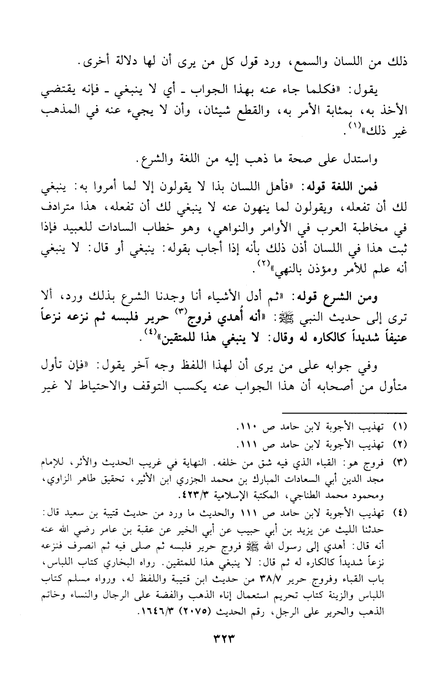 (¬4) تهذيب الأجوبة لابن حامد ص 111 والحديث ما ورد من حديث قتيبة بن سعيد قال: حدثنا الليث عن يزيد بن أبي حبيب عن أبي الخير عن عقبة بن عامر رضي الله عنه أنه قال: أهدي إلى رسول الله صلى الله عليه وسلم فروج حرير فلبسه ثم صلى فيه ثم انصرف فنزعه نزعا شديدا كالكاره له ثم قال: لا ينبغي هذا للمتقين. رواه البخاري كتاب اللباس، باب القباء وفروج حرير 7/ 38 من حديث ابن قتيبة واللفظ له، ورواه مسلم كتاب اللباس والزينة كتاب تحريم استعمال إناء الذهب والفضة على الرجال والنساء وخاتم الذهب والحرير على الرجل، رقم الحديث (2075) 3/ 1646.