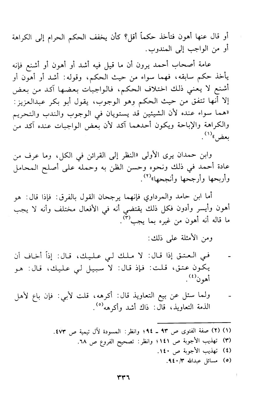 أما ابن حامد والمرداوي فإنهما يرجحان القول بالفرق: فإذا قال: هو أهون وأيسر وأدون فكل ذلك يقتضي أنه في الأفعال مختلف وأنّه لا يجب ما قاله أنه أهون من غيره بما يجب (¬3).