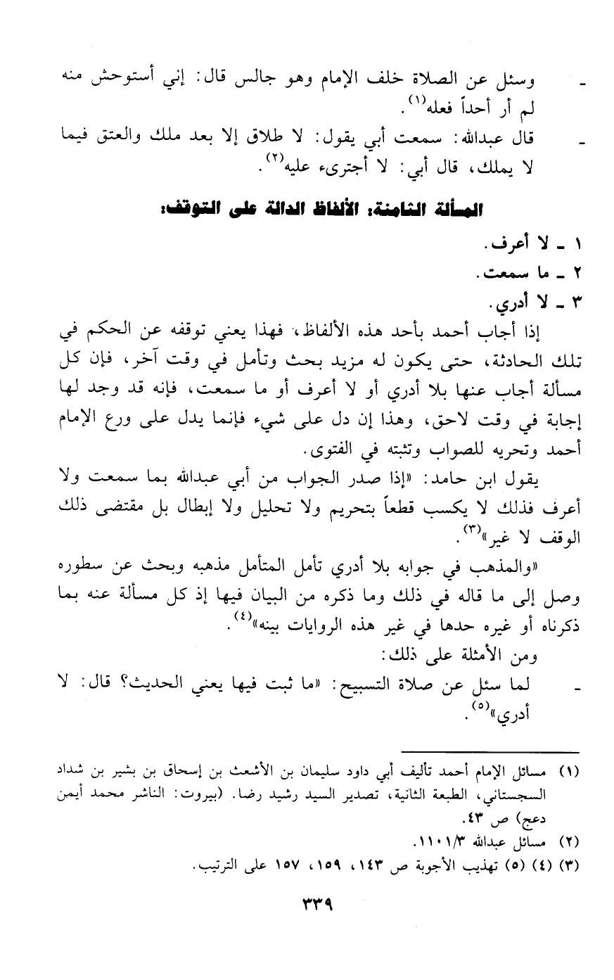 (¬1) مسائل الإمام أحمد تأليف أبي داود سليمان بن الأشعث بن إسحاق بن بشير بن شداد السجستاني، الطبعة الثانية، تصدير السيد رشيد رضا. (بيروت: الناشر محمد أيمن دعج) ص 43.
