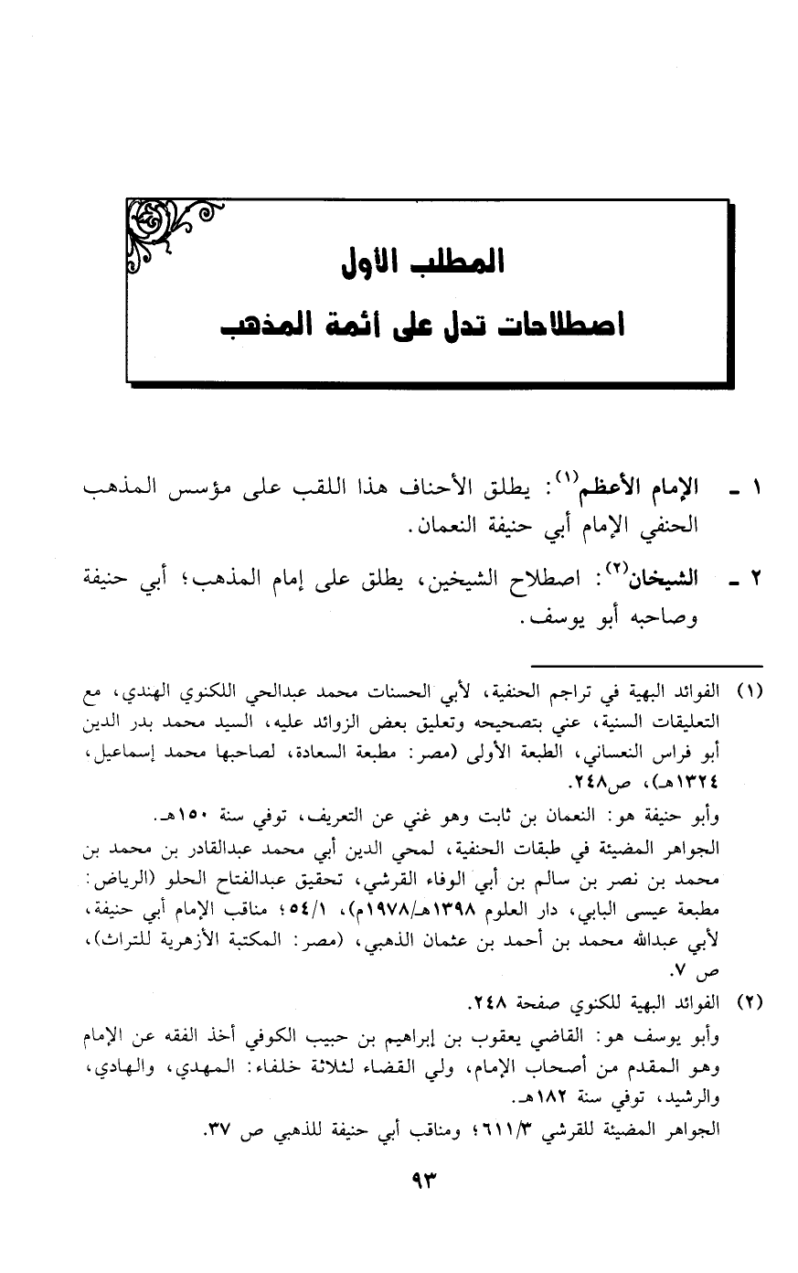 (¬1) الفوائد البهية في تراجم الحنفية، لأبي الحسنات محمد عبد الحي اللكنوي الهندي، مع التعليقات السنية، عني بتصحيحه وتعليق بعض الزوائد عليه، السيد محمد بدر الدين أبو فراس النعساني، الطبعة الأولى (مصر: مطبعة السعادة، لصاحبها محمد إسماعيل، 1324 هـ)، ص 248. وأبو حنيفة هو: النعمان بن ثابت وهو غني عن التعريف، توفي سنة 150 هـ. الجواهر المضيئة في طبقات الحنفية، لمحي الدين أبي محمد عبد القادر بن محمد بن محمد بن نصر بن سالم بن أبي الوفاء القرشي، تحقيق عبد الفتاح الحلو (الرياض: مطبعة عيسى البابي، دار العلوم 1398 هـ/1978 م)،1/ 54؛ مناقب الإمام أبي حنيفة، لأبي عبد الله محمد بن أحمد بن عثمان الذهبي، (مصر: المكتبة الأزهرية للتراث)، ص 7.