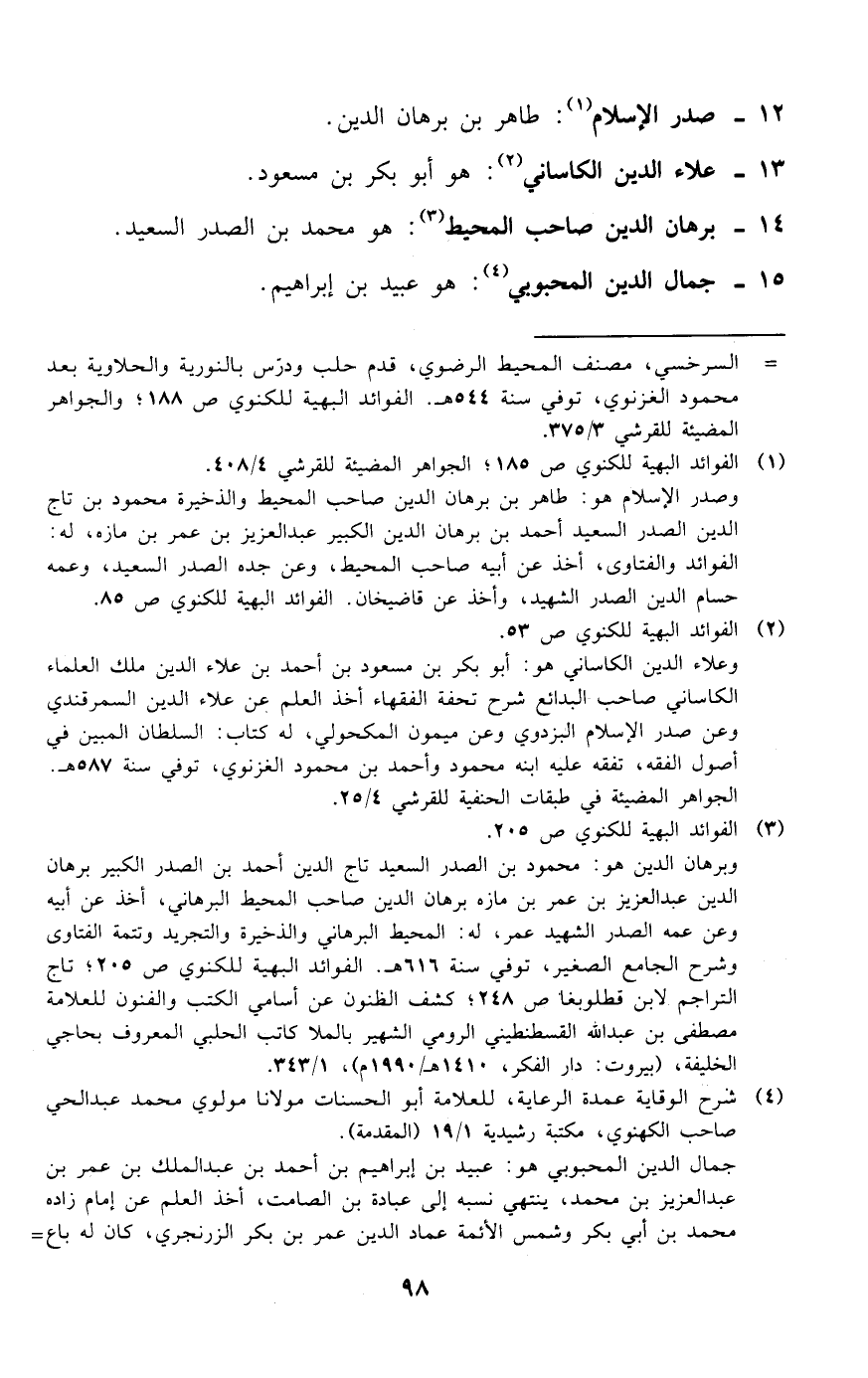 (¬3) الفوائد البهية للكنوي ص 205. وبرهان الدين هو: محمود بن الصدر السعيد تاج الدين أحمد بن الصدر الكبير برهان الدين عبد العزيز بن عمر بن مازه برهان الدين صاحب المحيط البرهاني، أخذ عن أبيه وعن عمه الصدر الشهيد عمر، له: المحيط البرهاني والذخيرة والتجريد وتتمة الفتاوى وشرح الجامع الصغير، توفي سنة 616 هـ. الفوائد البهية للكنوي ص 205؛ تاج التراجم لابن قطلوبغا ص 248؛ كشف الظنون عن أسامي الكتب والفنون للعلامة مصطفى بن عبد الله القسطنطيني الرومي الشهير بالملا كاتب الحلبي المعروف بحاجي الخليفة، (بيروت: دار الفكر،1410 هـ/1990 م)،1/ 343.