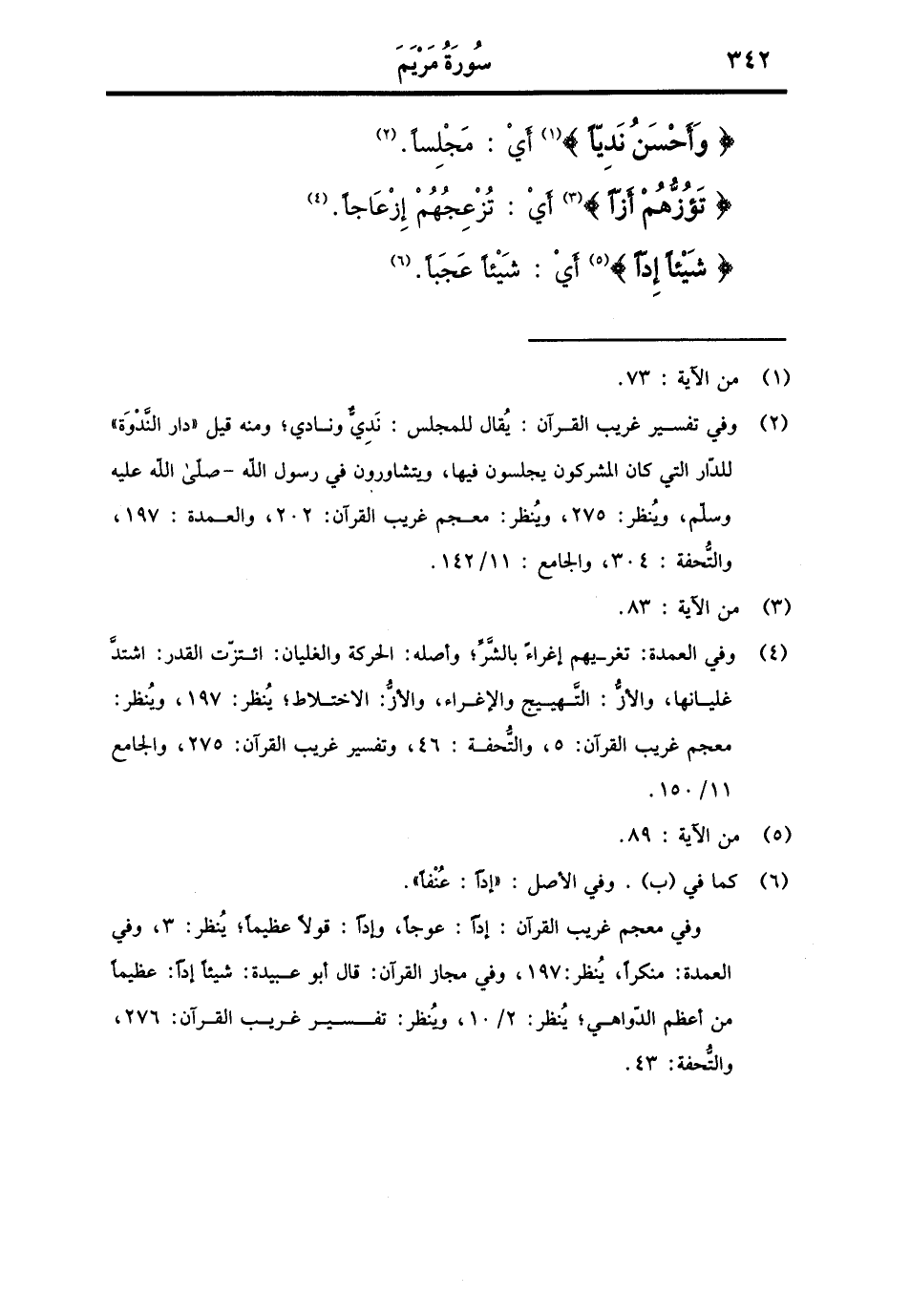 {وَأحسن نديا} أَي: مَجْلِسا. {تؤزهم أزا} أَي: تزعجهم إزعاجا. {شَيْئا إدا} أَي: شَيْئا عجبا.