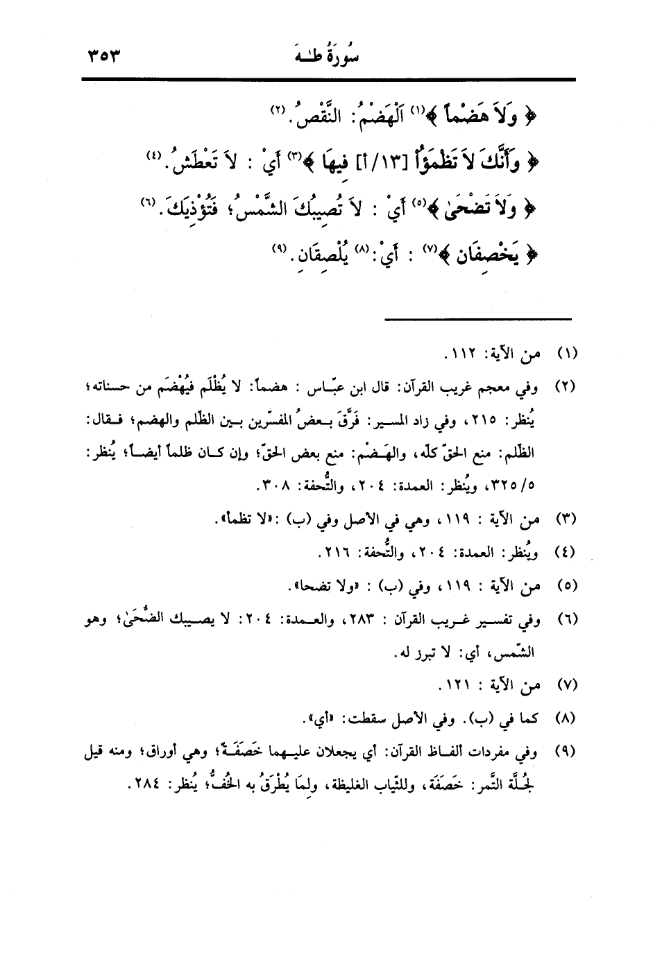 {وَلَا هضما} الهضم: النَّقْص. {وَأَنَّكَ لَا تَظْمَأُ [13 / أ] فِيهَا} أَي: لَا تعطش. {وَلَا تضحى} أَي: لَا تصيبك الشَّمْس، فتؤذيك. {يخصفان} : أَي: يلصقان.