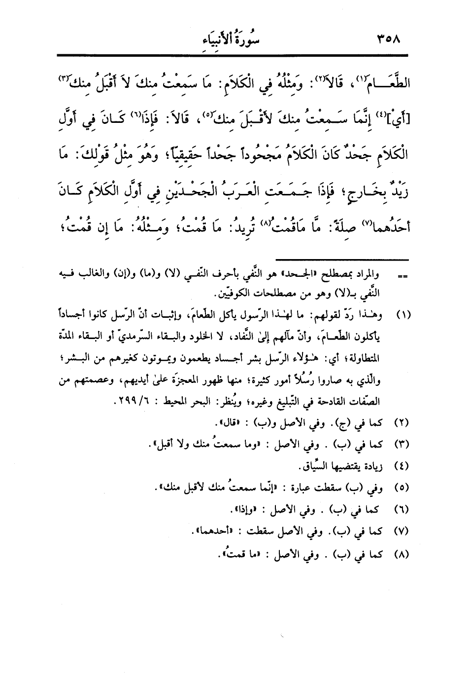 الطَّعَام، قَالَا: وَمثله فِي الْكَلَام: مَا سَمِعت مِنْك أقبل مِنْك [أَي] إِنَّمَا سَمِعت مِنْك لأقبل مِنْك، قَالَا: فَإِذا كَانَ فِي أول الْكَلَام جحد كَانَ الْكَلَام مجحودا جحدا حَقِيقِيًّا، وَهُوَ مثل قَوْلك: مَا زيد بِخَارِج، فَإِذا جمعت الْعَرَب الجحدين فِي أول الْكَلَام كَانَ أَحدهمَا صله: مَا قُمْت تُرِيدُ: مَا قُمْت، وَمثله: مَا إِن قُمْت،