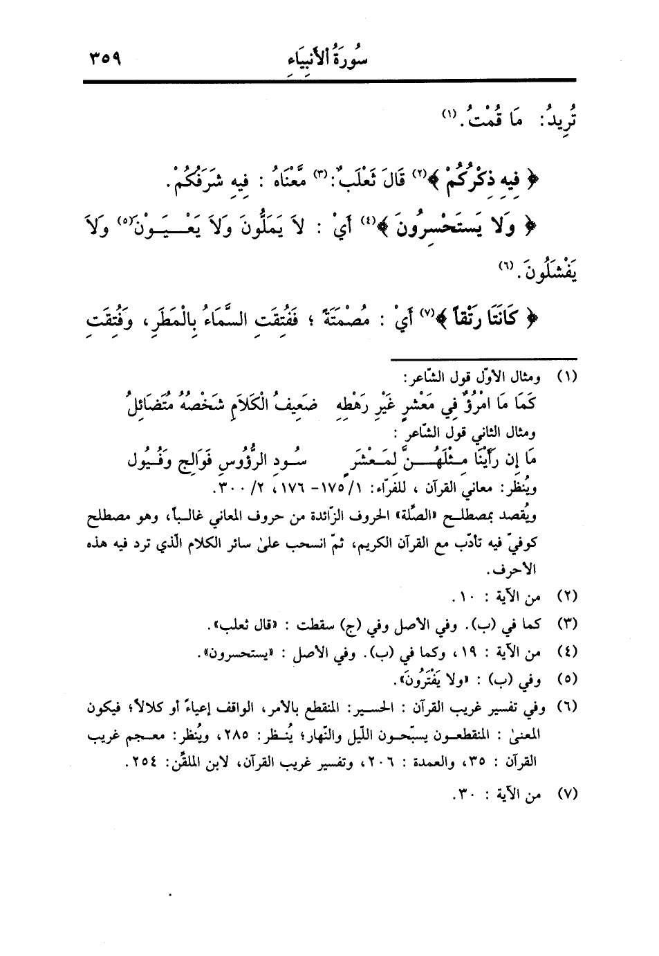 تُرِيدُ: مَا قُمْت. {فِيهِ ذكركُمْ} قَالَ ثَعْلَب: مَعْنَاهُ: فِيهِ شرفكم. {وَلَا يستحسرون} أَي: لَا يملون وَلَا يعيون وَلَا يفشلون. {كَانَتَا رتقا} أَي: مصمتة، ففتقت السَّمَاء بالمطر، وفتقت