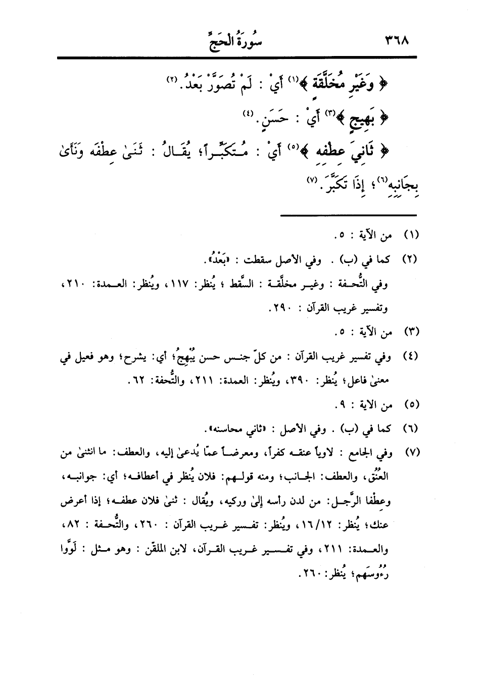 {وَغير مخلقة} أَي: لم تصور بعد. {بهيج} أَي: حسن. {ثَانِي عطفه} أَي: متكبرا، يُقَال: ثنى عطفه ونأى بجانبه، إِذا تكبر.