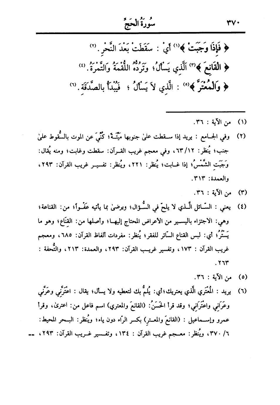 {فَإِذا وَجَبت} أَي: سَقَطت بعد النَّحْر. {القانع} الَّذِي يسْأَل: وترده اللُّقْمَة وَالتَّمْرَة. {والمعتر} : الَّذِي لَا يسْأَل، فَيبْدَأ بِالصَّدَقَةِ.