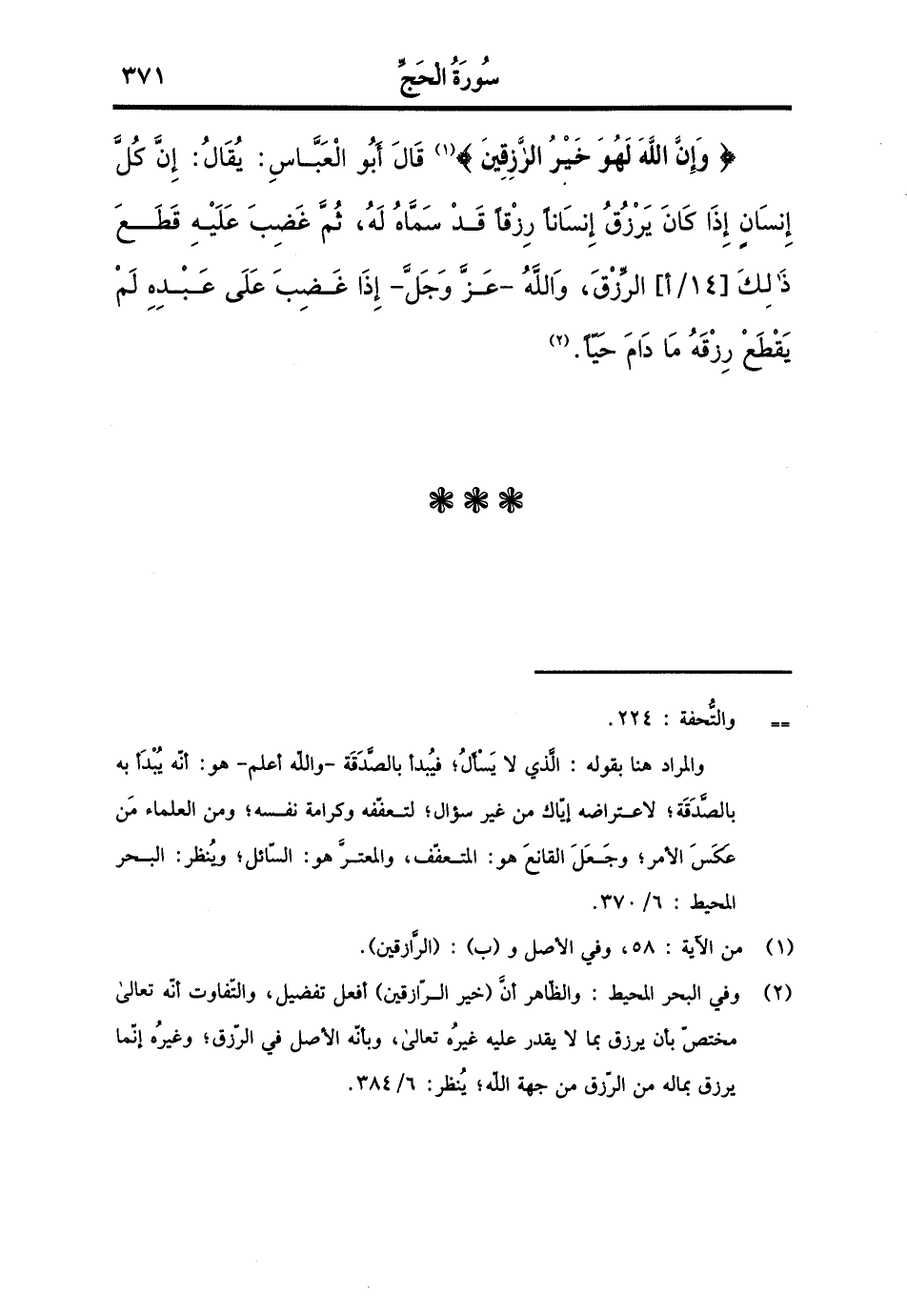 {وَإِن الله لَهو خير الرازقين} قَالَ أَبُو الْعَبَّاس: يُقَال: إِن كل إنْسَانا إِذا كَانَ يرْزق إِنْسَان رزقا قد سَمَّاهُ لَهُ، ثمَّ غضب عَلَيْهِ قطع ذَلِك [14 / أ] الرزق، وَالله - عز وَجل - إِذا غضب على عَبده لم يقطع رزقه مَا دَامَ حَيا.