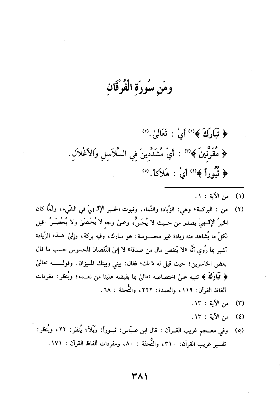 {تبَارك} أَي: تَعَالَى. {مُقرنين} : أَي مشددين فِي السلال والأغلال. {ثبورا} أَي: هَلَاكًا.