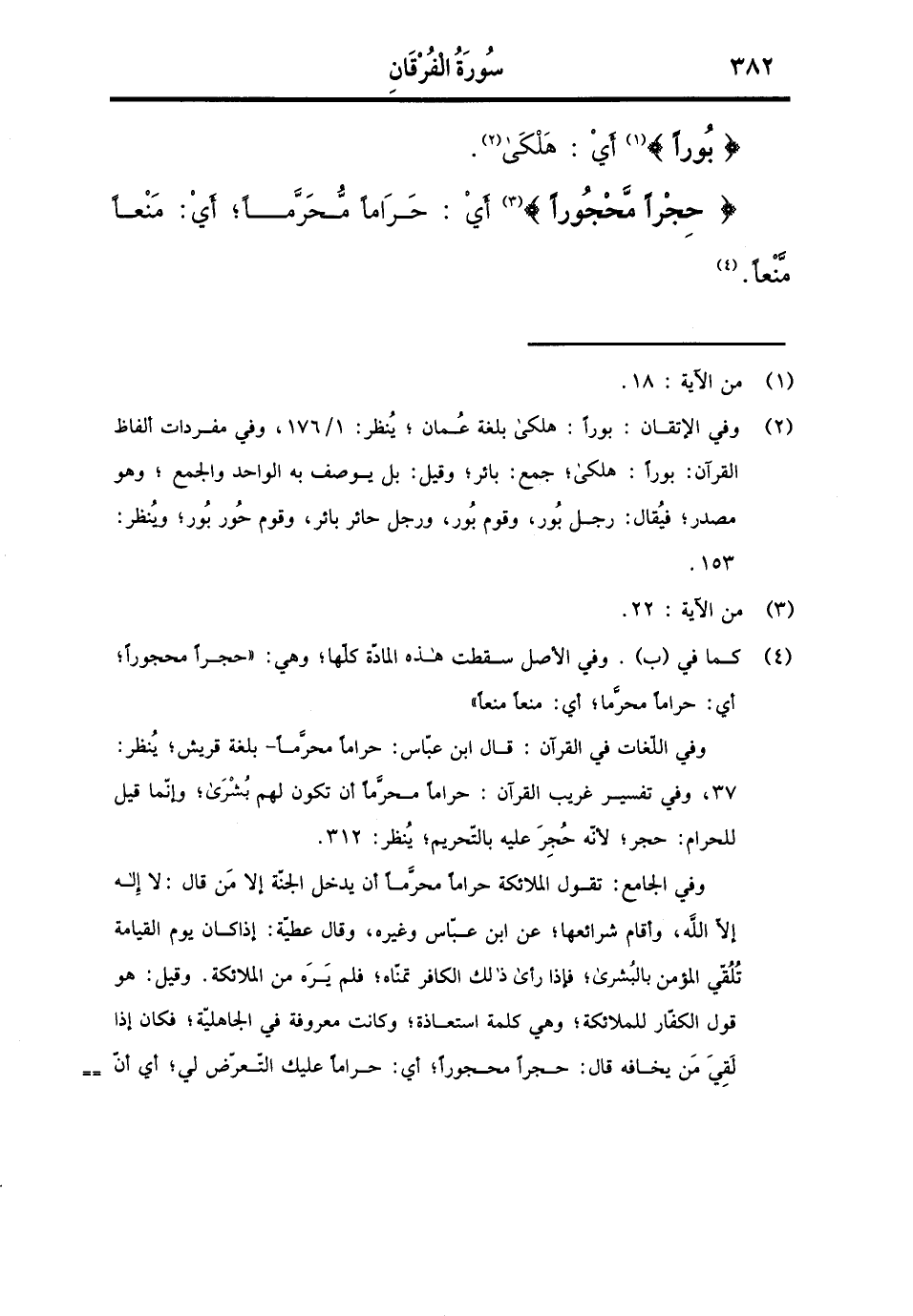 {بورا} أَي: هلكى. {حجرا مَحْجُورا} أَي: حَرَامًا محرما، أَي: منعا منعا.