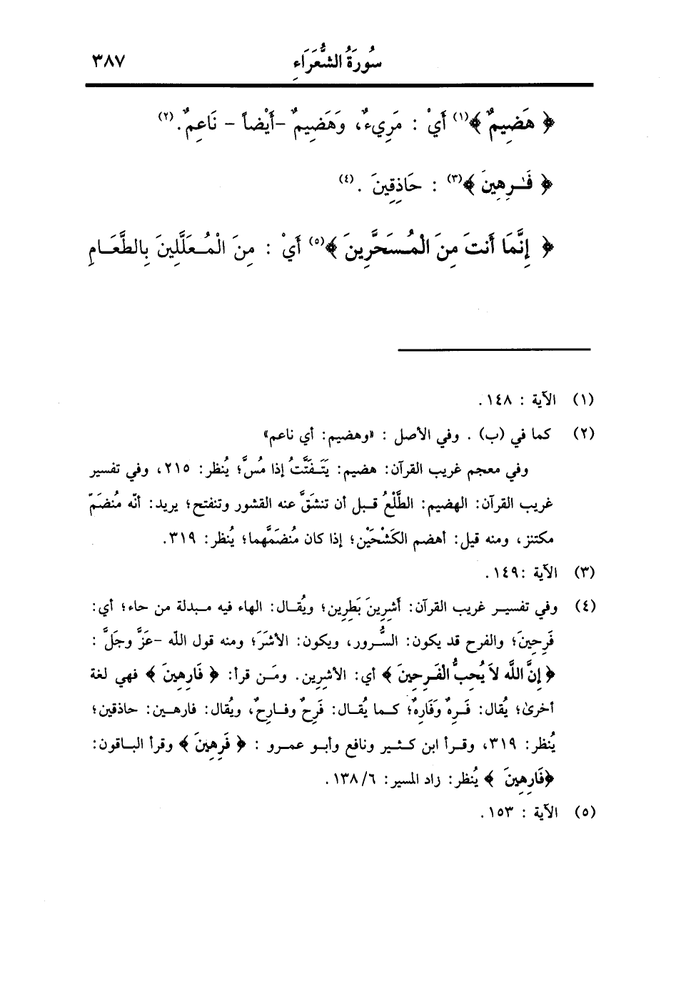 {هضيم} أَي: مريء، وهضيم - أَيْضا - ناعم. {فارهين} : حاذقين. {إِنَّمَا أَنْت من المسحرين} أَي: من المعللين بِالطَّعَامِ
