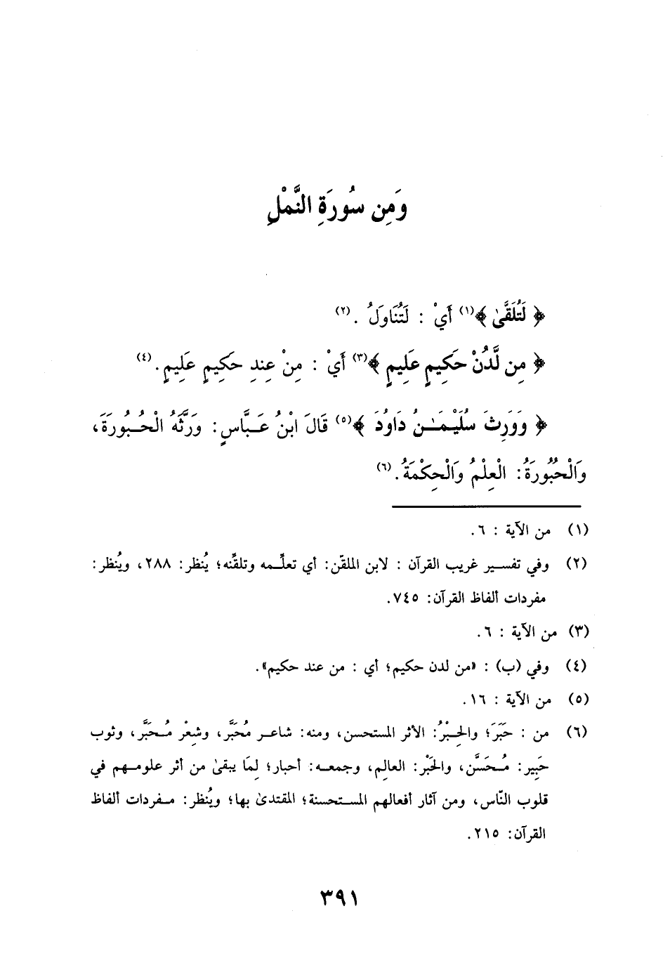 {لتلقى} أَي: لتناول. {من لدن حَكِيم عليم} أَي: من عِنْد حَكِيم عليم. {وَورث سُلَيْمَان دَاوُد} قَالَ ابْن عَبَّاس: وَرثهُ الحبورة، والحبورة: الْعلم وَالْحكمَة.