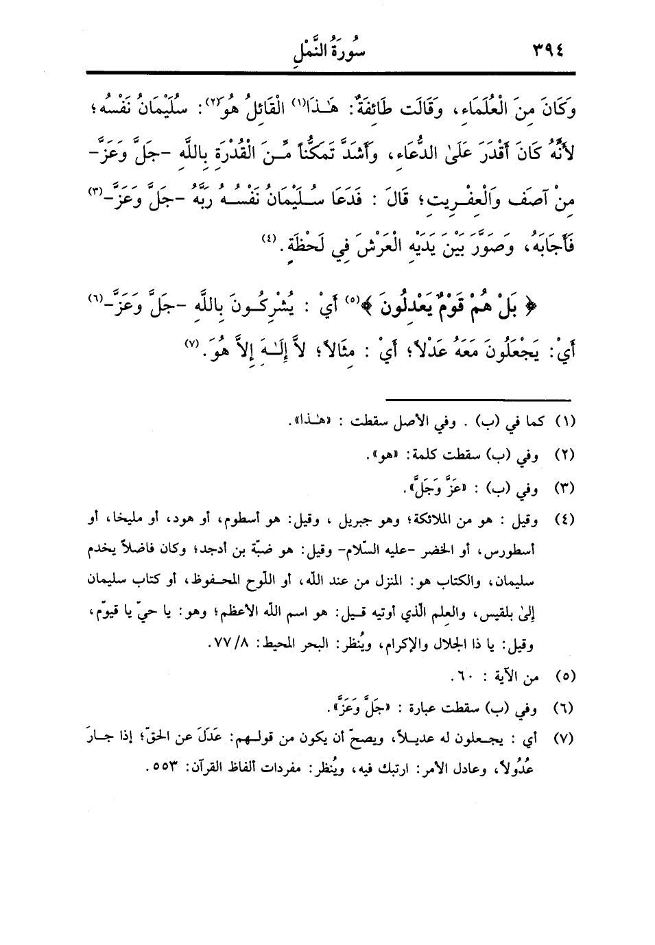 وَكَانَ من الْعلمَاء، وَقَالَت طَائِفَة: هَذَا الْقَائِل هُوَ: سُلَيْمَان نَفسه، لِأَنَّهُ كَانَ أقدر على الدُّعَاء، وَأَشد تمَكنا من الْقُدْرَة بِاللَّه - جلّ وَعز - من آصف والعفريت، قَالَ: فَدَعَا سُلَيْمَان نَفسه ربه - جلّ وَعز - فَأَجَابَهُ، وصور بَين يَدَيْهِ الْعَرْش فِي لَحْظَة. {بل هم قوم يعدلُونَ} أَي: يشركُونَ بِاللَّه - جلّ وَعز - أَي: يجْعَلُونَ مَعَه عدلا، أَي: مِثَالا، لَا إِلَه إِلَّا هُوَ.