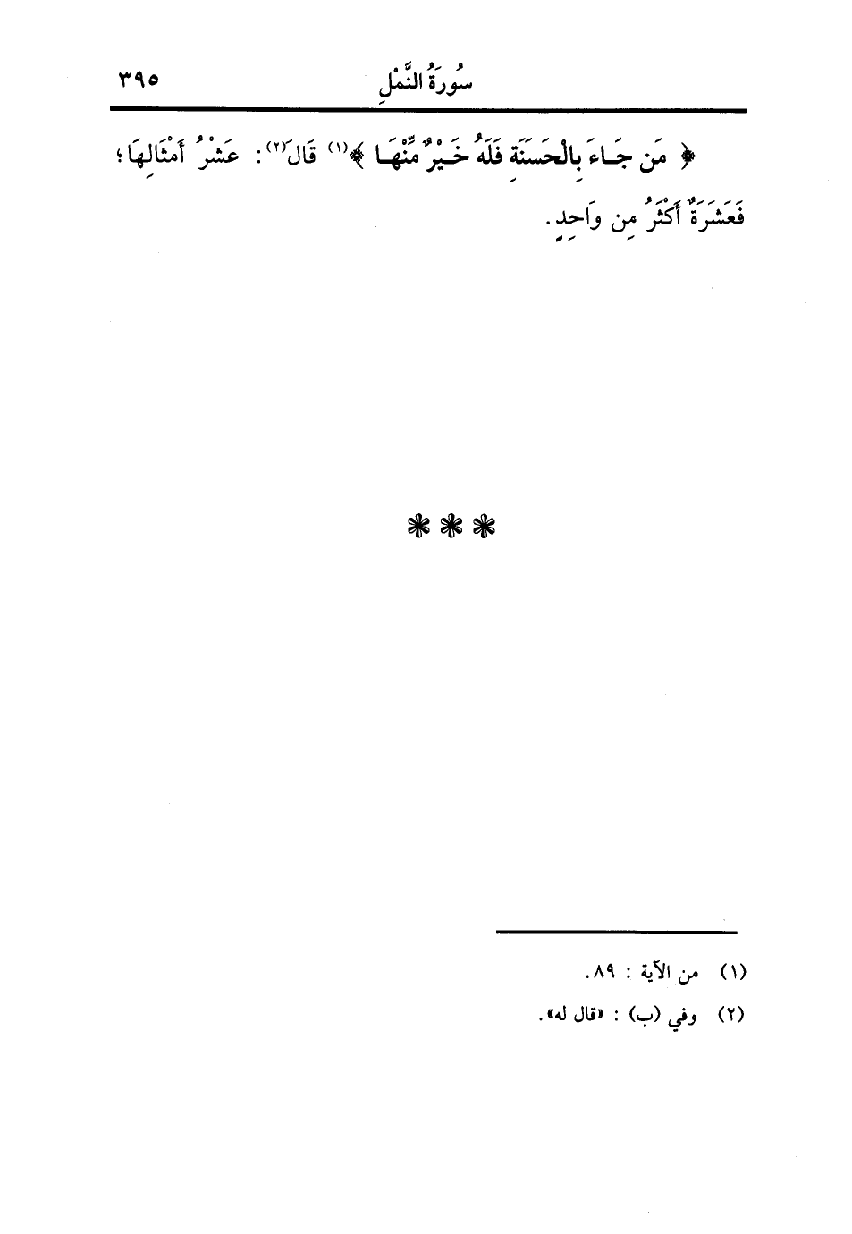 {من جَاءَ بِالْحَسَنَة فَلهُ خير مِنْهَا} قَالَ: عشر أَمْثَالهَا، فعشرة اكثر من وَاحِد.