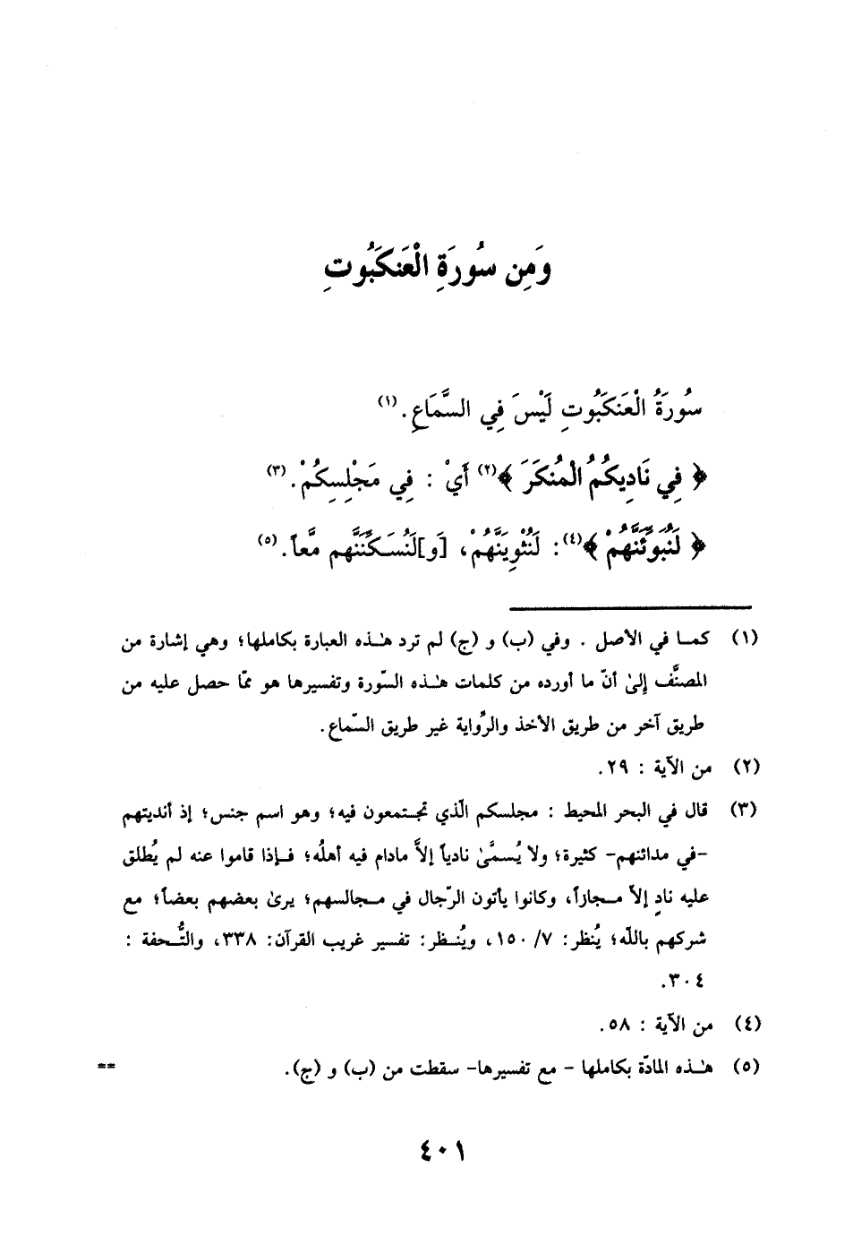 سُورَة العنكبوت لَيْسَ فِي السماع. {فِي نَادِيكُمُ الْمُنْكَرَ} أَي: فِي مجلسكم. {لنبوئنهم} : لنثوينهم،