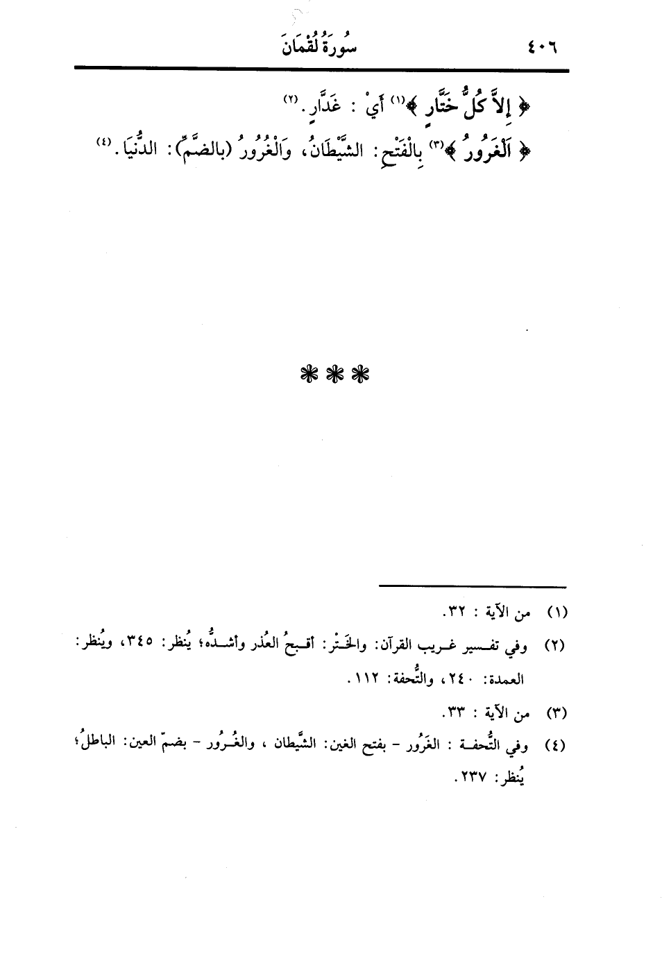 {إِلَّا كل ختار} أَي: غدار. {الْغرُور} بِالْفَتْح: الشَّيْطَان، والغرور (بِالضَّمِّ) : الدُّنْيَا.
