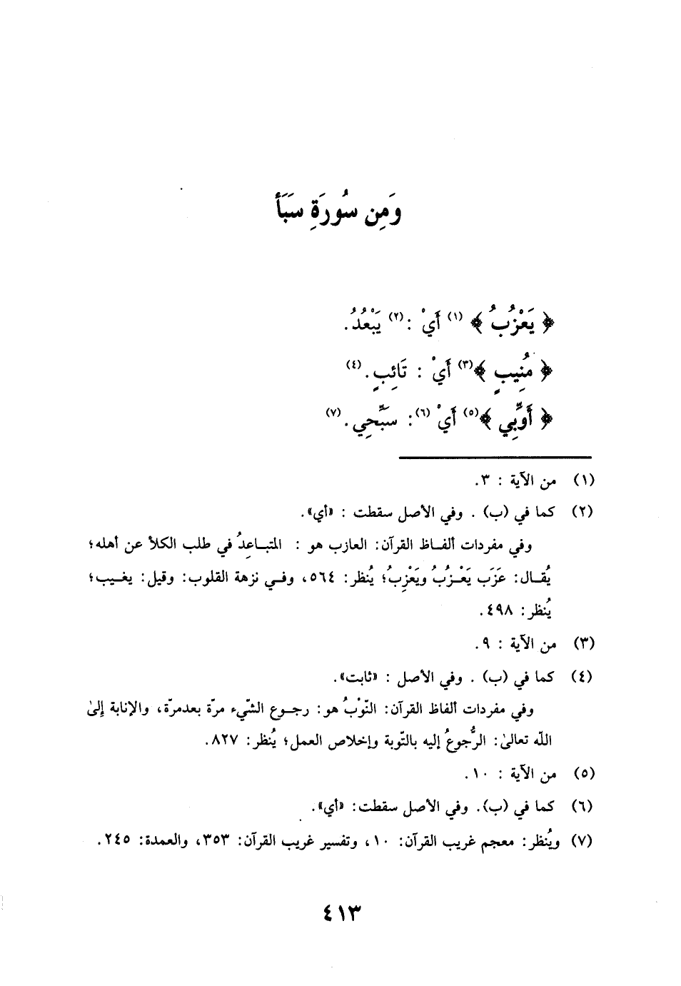 {يعزب} أَي: يبعد. {منيب} أَي: تائب. {أوبي} أَي: سبحي.