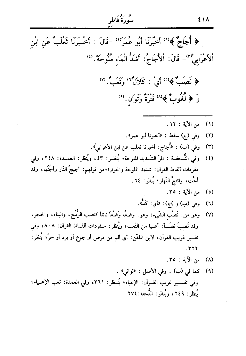 {أجاج} أخبرنَا أَبُو عمر - قَالَ: أخبرنَا ثَعْلَب عَن ابْن الْأَعرَابِي - قَالَ: الأجاج أَشد المَاء ملوحة. {نصب} أَي: كلال وتعب. و {لغوب} فَتْرَة وتوان.