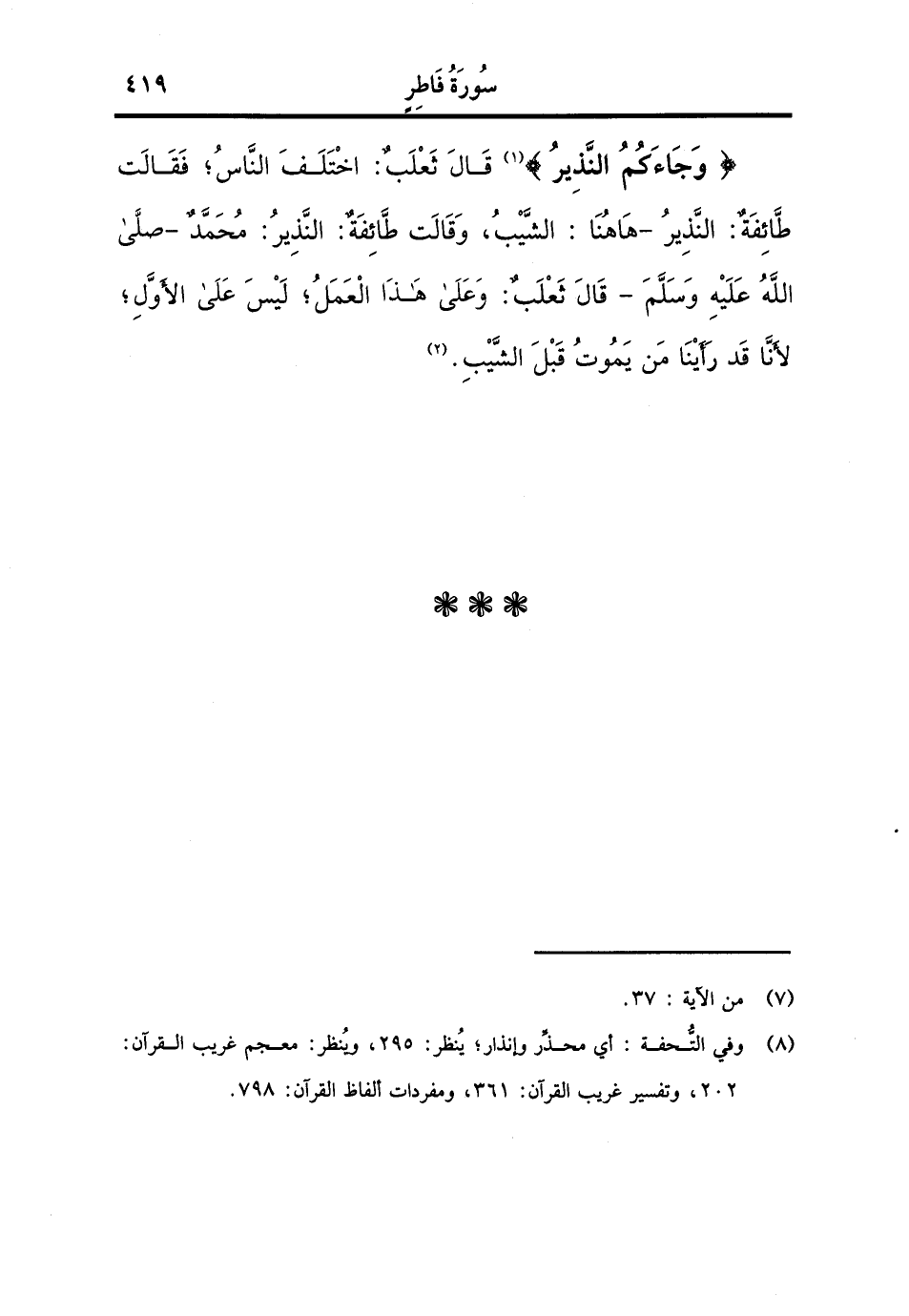 {وَجَاءَكُم النذير} قَالَ ثَعْلَب: اخْتلف النَّاس، فَقَالَت طَائِفَة: النذير - هَاهُنَا: الشيب، وَقَالَت طَائِفَة: النذير: مُحَمَّد - صلى الله عَلَيْهِ وَسلم - قَالَ ثَعْلَب: وعَلى هَذَا الْعَمَل، لَيْسَ على الأول، لأَنا قد رَأينَا من يَمُوت قبل الشيب