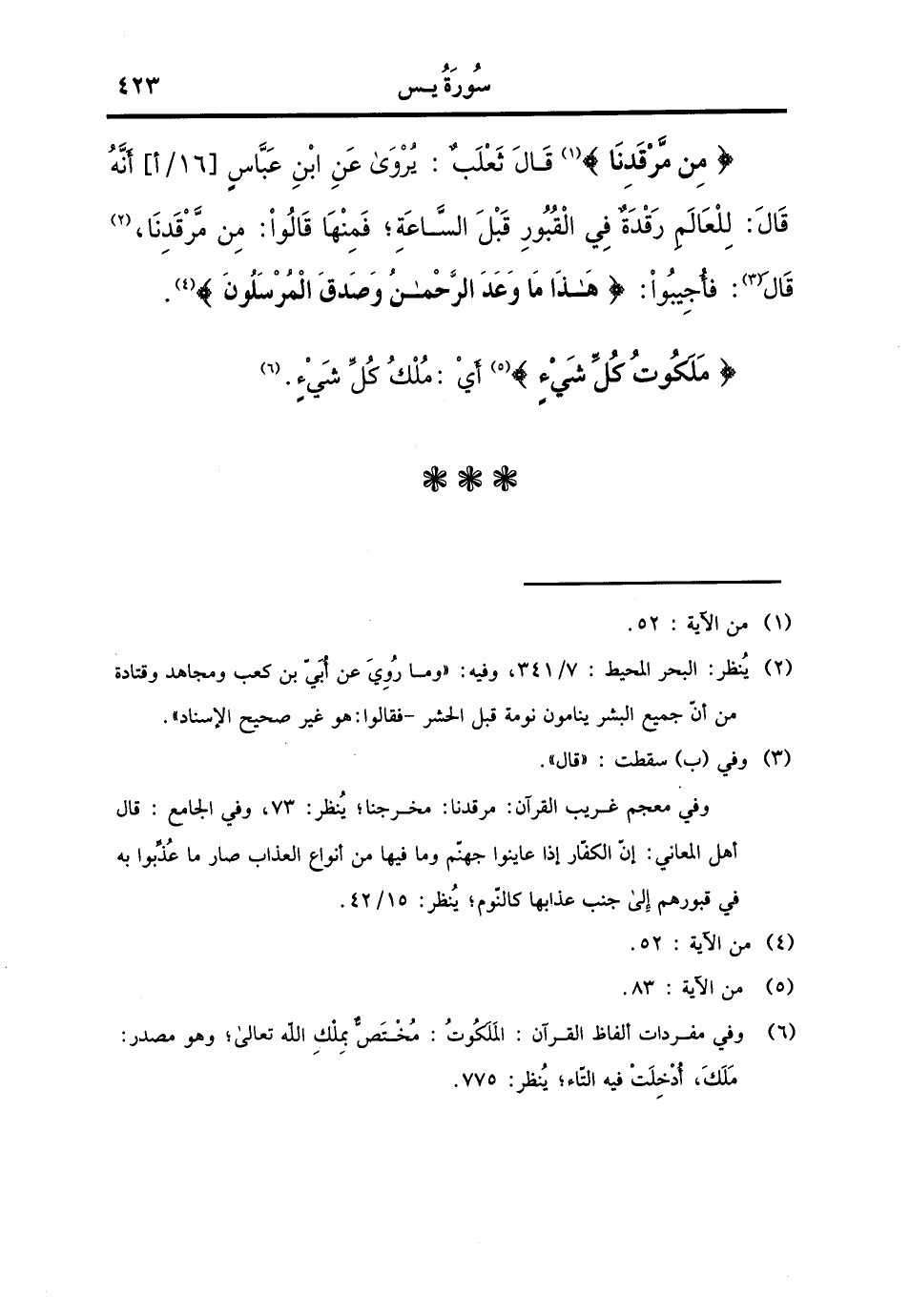 {من مرقدنا} قَالَ ثَعْلَب: يرْوى عَن ابْن عَبَّاس انه [16 / أ] قَالَ: للْعَالم رقدة فِي الْقُبُور قبل السَّاعَة، فَمِنْهَا قَالُوا: من مرقدنا، قَالَ: فأجيبوا: {هَذَا مَا وعد الرَّحْمَن وَصدق المُرْسَلُونَ} . {مَلَكُوتُ كُلِّ شَيْءٍ} أَي: ملك كل شَيْء.