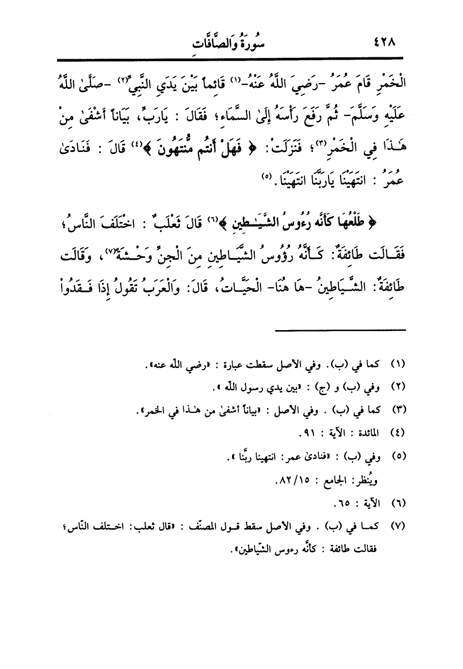 الْخمر قَامَ عمر - رَضِي الله عَنهُ - قَائِما بَين يَدي النَّبِي - صلى الله عَلَيْهِ وَسلم - ثمَّ رفع رَأسه إِلَى السَّمَاء، فَقَالَ: يَا رب، بَيَانا أشفي من هَذَا فِي الْخمر، فَنزلت: {فَهَل أَنْتُم مُنْتَهُونَ} قَالَ: فَنَادَى عمر: انتهينا يَا رَبنَا انتهينا. {طلعها كَأَنَّهُ رُؤُوس الشَّيَاطِين} قَالَ ثَعْلَب: اخْتلف النَّاس، فَقَالَت طَائِفَة: كأنة رُؤُوس الشَّيَاطِين من الْجِنّ وَحْشَة، وَقَالَت طَائِفَة: الشَّيَاطِين - هَا هُنَا - الْحَيَّات، قَالَ: وَالْعرب تَقول إِذا فقدوا