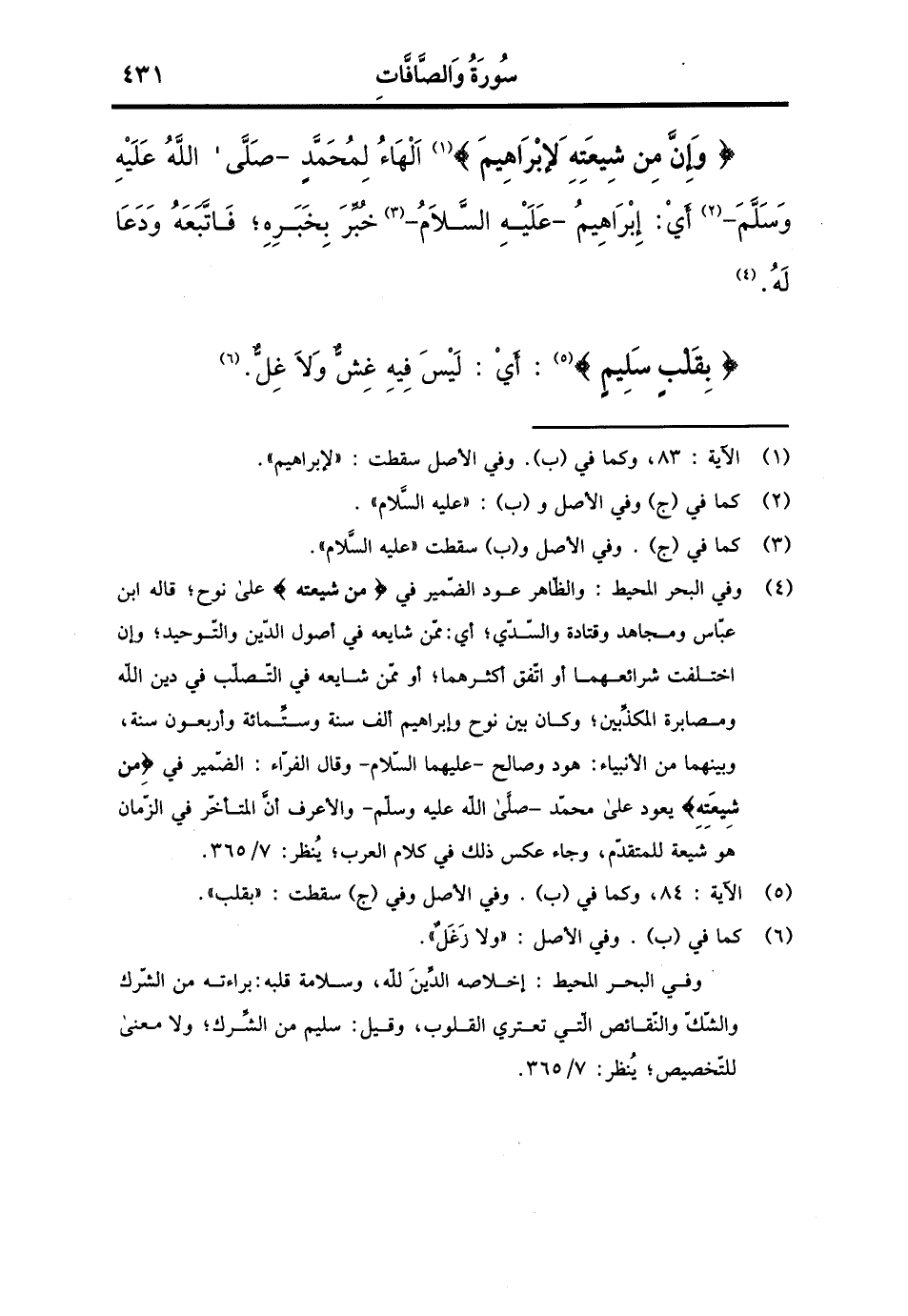 {وَإِن من شيعته لإِبْرَاهِيم} الْهَاء لمُحَمد - صلى الله عَلَيْهِ وَسلم - أَي: إِبْرَاهِيم - عَلَيْهِ السَّلَام - خبر بِخَبَرِهِ، فَاتبعهُ ودعا لَهُ. {بقلب سليم} : أَي: لَيْسَ فِيهِ غش وَلَا غل.