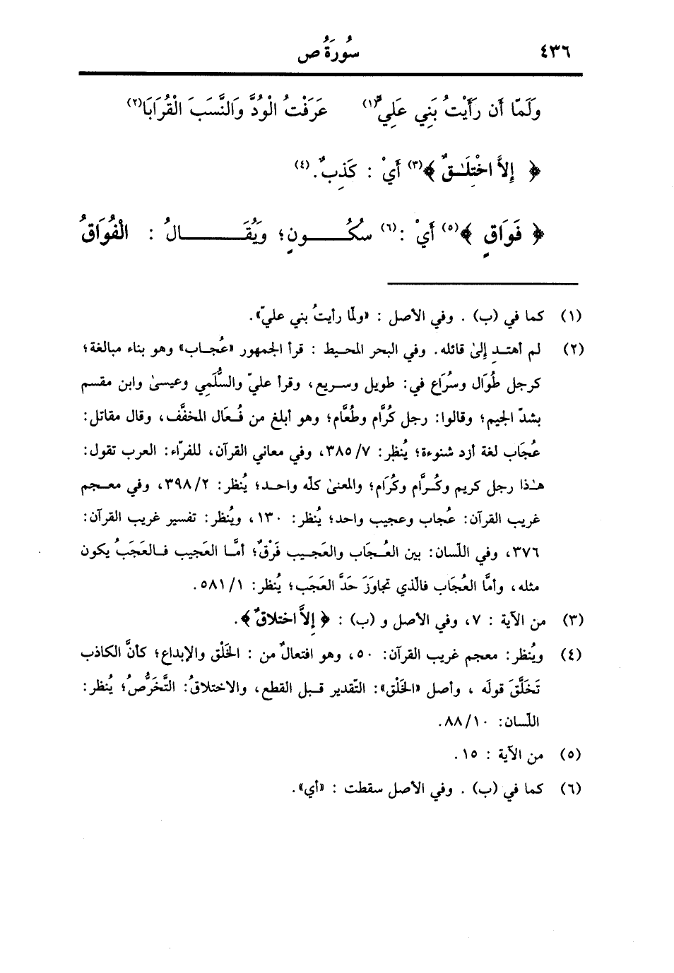 وَلما أَن رَأَيْت بني عَليّ / عرفت الود وَالنّسب القرابا {إِلَّا اخْتِلَاق} أَي: كذب. {فوَاق} أَي: سُكُون، وَيُقَال: الفواق