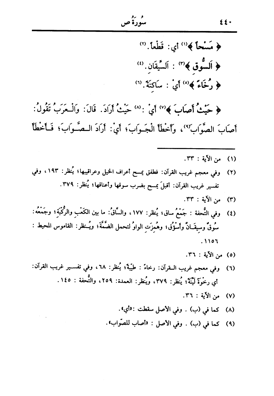 {مسحا} أَي: قطعا. {بِالسوقِ} : السيقان. {رخاء} أَي: سَاكِنة. {حَيْثُ أصَاب} أَي: حَيْثُ أَرَادَ. قَالَ: وَالْعرب تَقول: أصَاب الصَّوَاب، وَأَخْطَأ الْجَواب، أَي: أَرَادَ الصَّوَاب، فَأَخْطَأَ