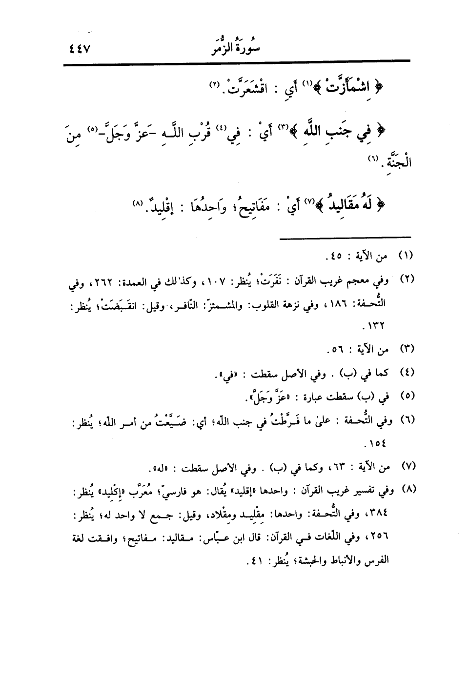 {اشمأزت} أَي: اقشعرت. {فِي جنب الله} أَي: فِي قرب الله - عز وَجل - من الْجنَّة. {لَهُ مقاليد} أَي: مَفَاتِيح، وَاحِدهَا: إقليد.