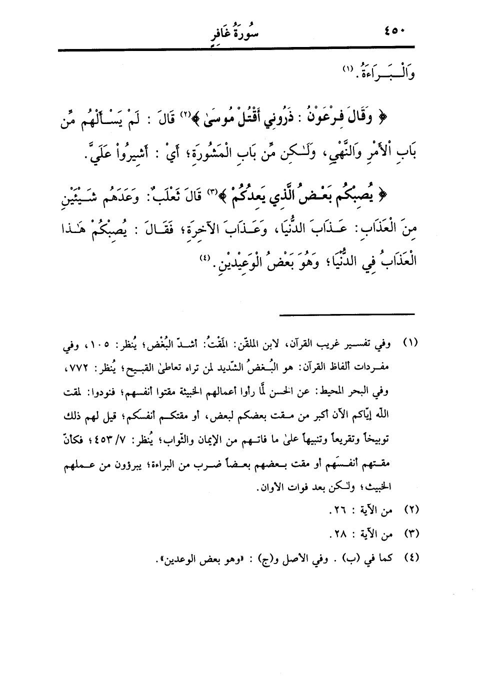والبراءة. {وَقَالَ فِرْعَوْن ذروني أقتل مُوسَى} قَالَ: لم يسألهم من بَاب الْأَمر وَالنَّهْي، وَلَكِن من بَاب المشورة، أَي: أَشِيرُوا عَليّ. {يصبكم بعض الَّذِي يَعدكُم} قَالَ ثَعْلَب: وعدهم شَيْئَيْنِ من الْعَذَاب: عَذَاب الدُّنْيَا، وَعَذَاب الْآخِرَة، فَقَالَ: يصبكم هَذَا الْعَذَاب فِي الدُّنْيَا، وَهُوَ بعض الوعيدين.