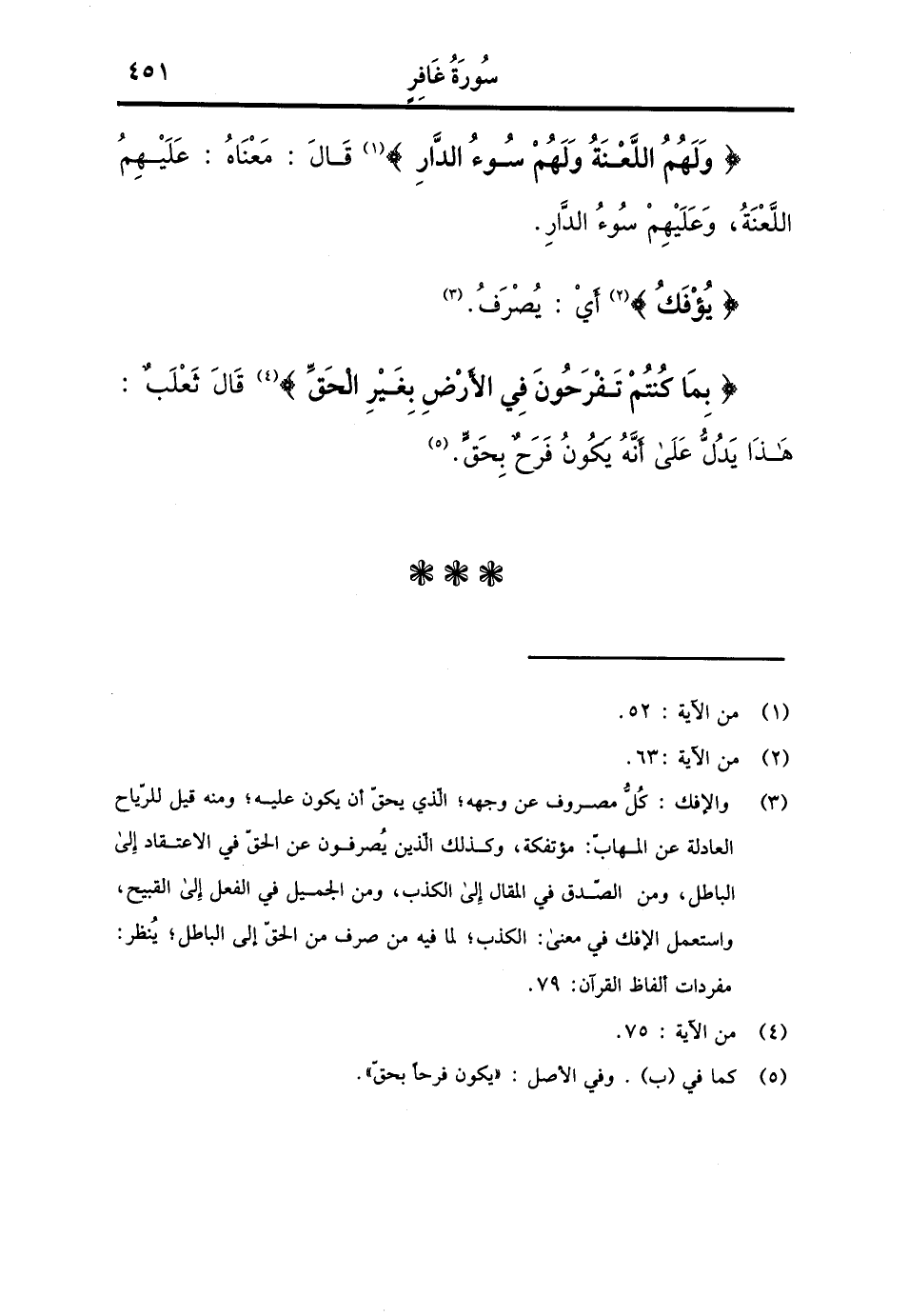 {وَلَهُم اللَّعْنَة وَلَهُم سوء الدَّار} قَالَ: مَعْنَاهُ: عَلَيْهِم اللَّعْنَة، وَعَلَيْهِم سوء الدَّار. {يؤفك} أَي: يصرف. {بِمَا كُنْتُم تفرحون فِي الأَرْض بِغَيْر الْحق} قَالَ ثَعْلَب: هَذَا يدل على انه يكون فَرح بِحَق.