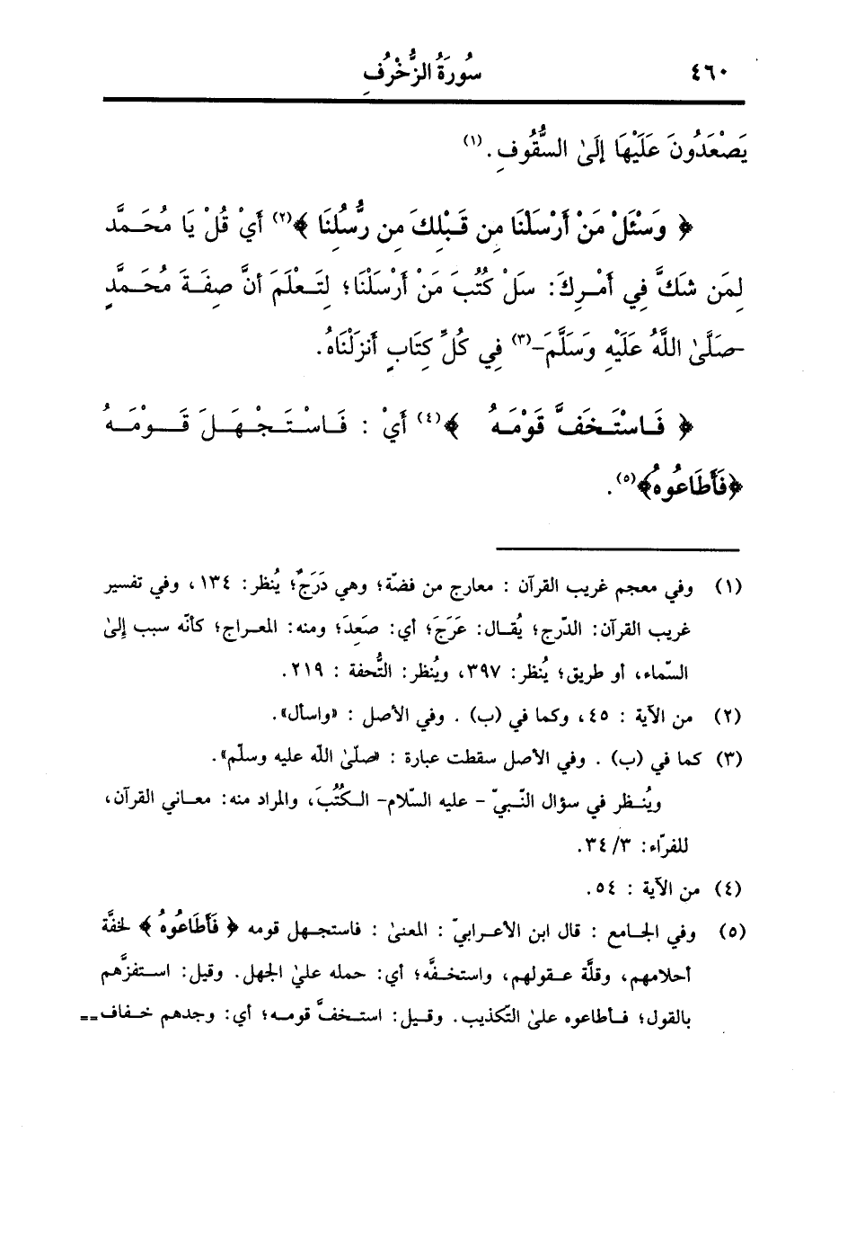يصعدون عَلَيْهَا إِلَى السقوف. {وسئلْ مَنْ أَرْسَلْنَا مِنْ قَبْلِكَ مِنْ رُسُلِنَا} أَي قل يَا مُحَمَّد لمن شكّ فِي أَمرك: سل كتب من أرسلنَا، لتعلم أَن صفة مُحَمَّد - صلى الله عَلَيْهِ وَسلم - فِي كل كتاب أَنزَلْنَاهُ. {فاستخف قومه} أَي: فاستجهل قومه {فأطاعوه} .