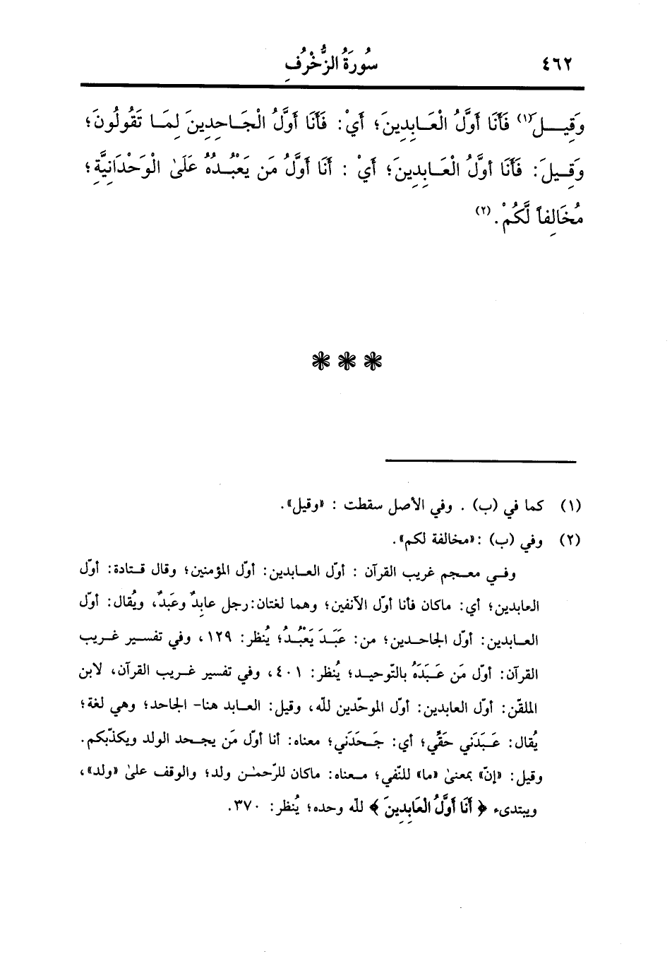 وَقيل فَأَنا أول العابدين، أَي: فَأَنا أول الجاحدين لما تَقولُونَ، وَقيل: فَأَنا أول العابدين، أَي: أَنا أول من يعبده على الوحدانية، مُخَالفا لكم.