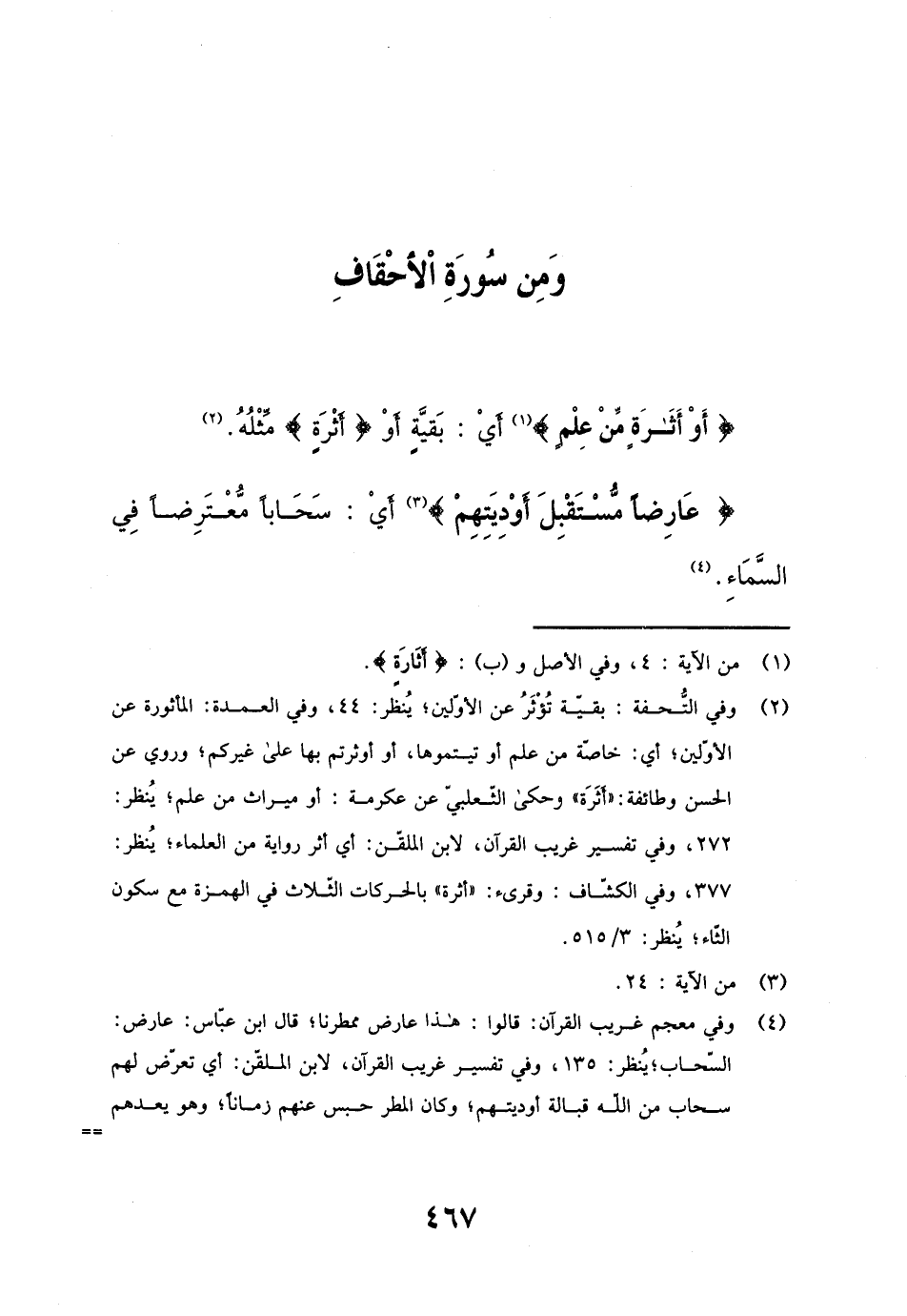 {أَواثَارَةٍ مِنْ عِلْمٍ} أَي: بَقِيَّة أَو {آثاره} مثله. {عارضا مُسْتَقْبل أَوْدِيَتهمْ} أَي: سحابا مُعْتَرضًا فِي السَّمَاء.