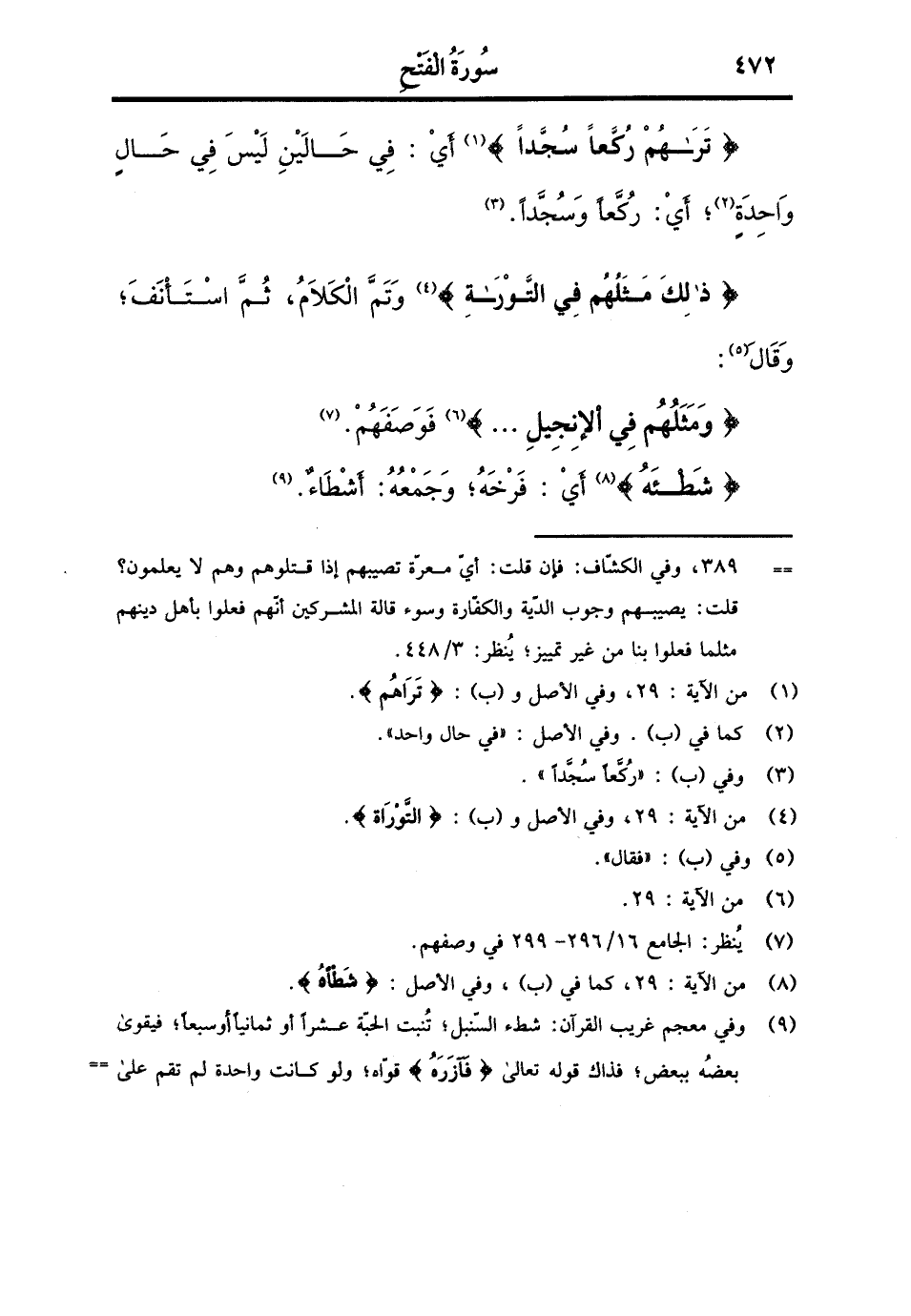 {تراهم ركعا سجدا} أَي: فِي حَالين لَيْسَ فِي حَال وَاحِدَة، أَي: ركعا وَسجدا. {ذَلِك مثلهم فِي التَّوْرَاة} وَتمّ الْكَلَام، ثمَّ اسْتَأْنف، وَقَالَ: {وَمثلهمْ فِي الْإِنْجِيل} فوصفهم. {شطأه} أَي: فرخه، وَجمعه: أشطأء.