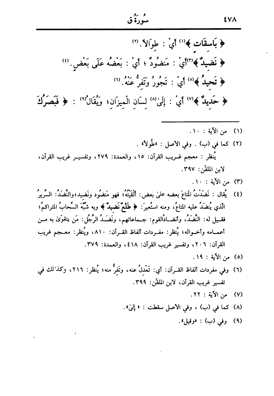 {باسقات} أَي: طوَالًا. {نضيد} أَي: منضود، أَي: بعضه على بعض. {تحيد} أَي: تجور وتفر عَنهُ. {حَدِيد} أَي: إِلَى لِسَان الْمِيزَان، وَيُقَال: (فَبَصَرُكَ