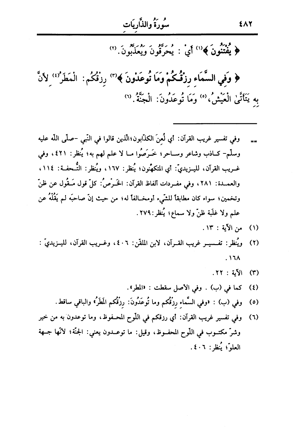 {يفتنون} أَي: يحرقون ويعذبون. {وَفِي السَّمَاء رزقكم وَمَا توعدون} رزقكم: الْمَطَر لِأَن بِهِ يَتَأَتَّى الْعَيْش، وَمَا توعدون: الْجنَّة.